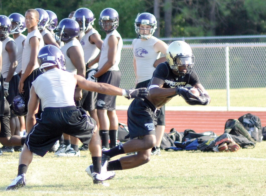 The Fairfield Central Griffins tested their passing and pass defense skills at the Camden 7-on-7 tournament last week. Pictured: DeVante Foster slips a tackle in the early stages of a match against Ridge View High School.