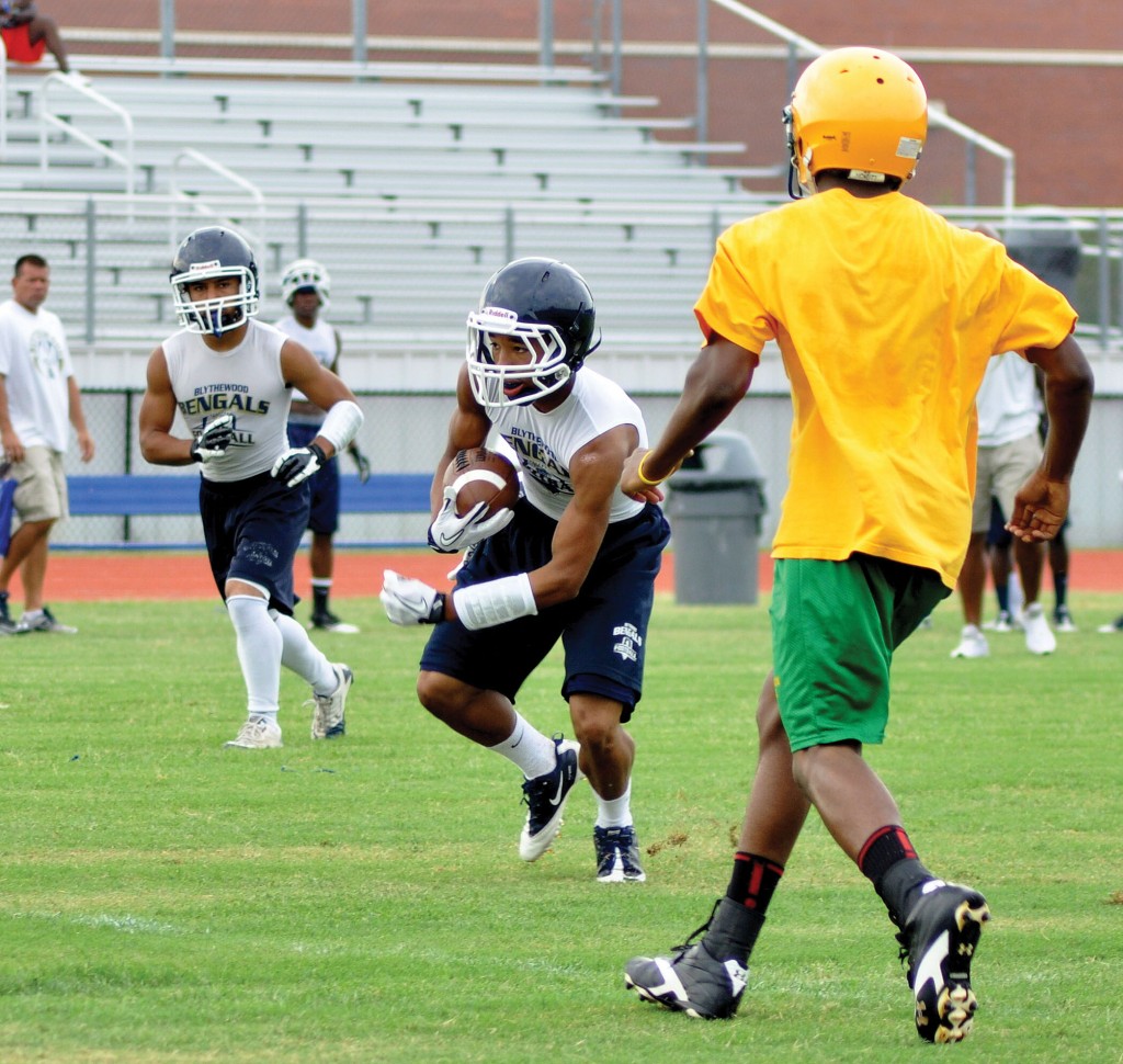 High schools from across the state gathered at Blythewood High School Saturday to test their passing and pass defense games. Linemen also tested their skills in the Top-Dawg Lineman Challenge, won this year by Lancaster High School. Wren High School defeated Irmo 28-11 in the finals to win the 7-on-7 passing tournament for the second consecutive year. Pictured: Blythewood’s Javon Smith slips past the C.A. Johnson defense.