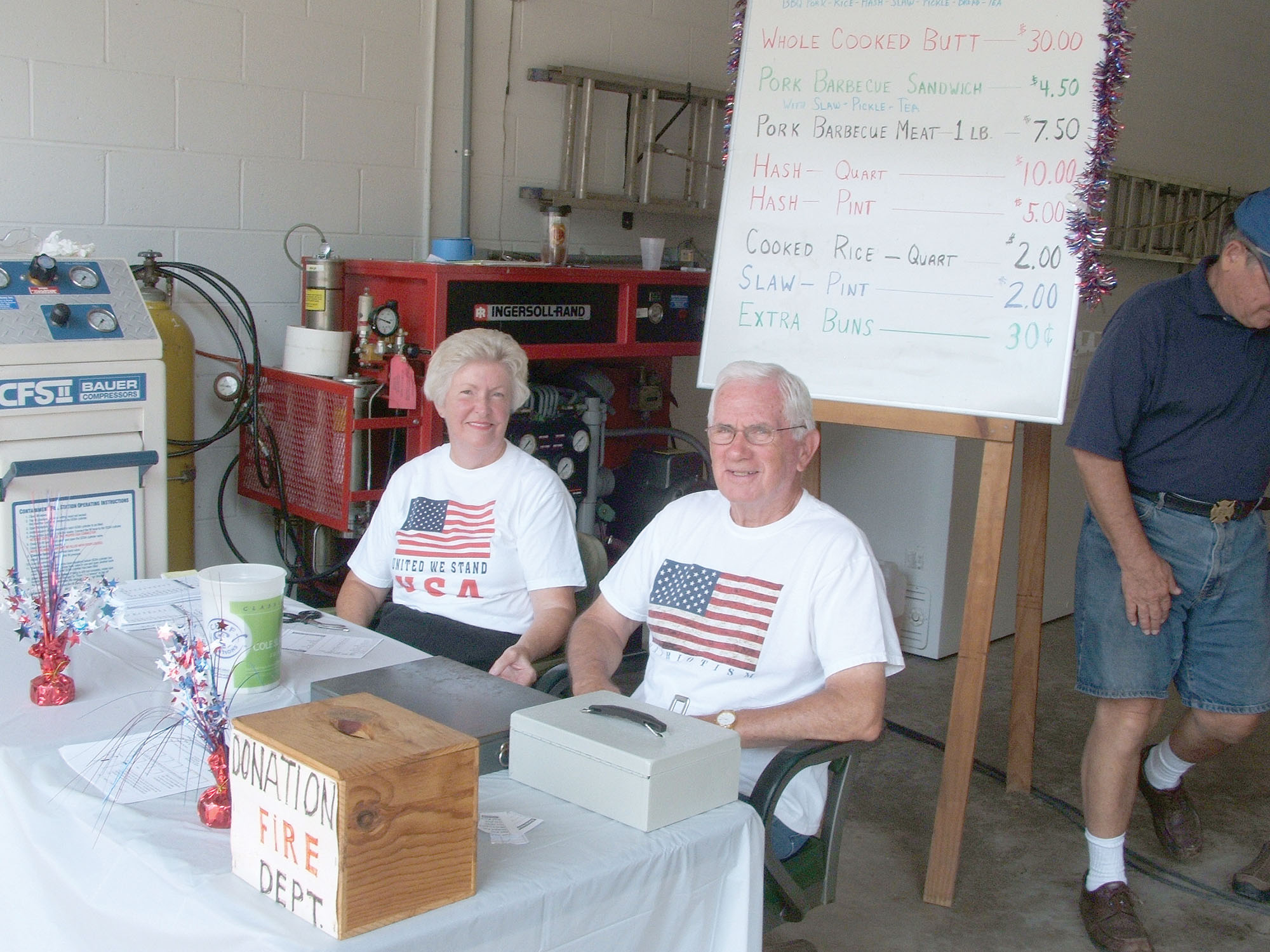 Lake Wateree residents Peggy & Roy Lee taking orders at Dutchman Creek Volunteer Fire Department July 4 barbecue sale.