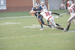 The South Pointe Stallions scored 26 points in the second half to hand the Blythewood Bengals a 39-16 loss in their first game of the 2012 season.  The Stallions defense was tumultuous throughout the game, forcing five fumbles, recording eight sacks and intercepting two passes.  With their eight sacks last week in a win over Irmo (17-10), South Pointe now has 16 total for the year.  After the game Bengals head coach Reggie Kennedy was not surprised by South Pointe’s ability to put pressure on the quarterback.