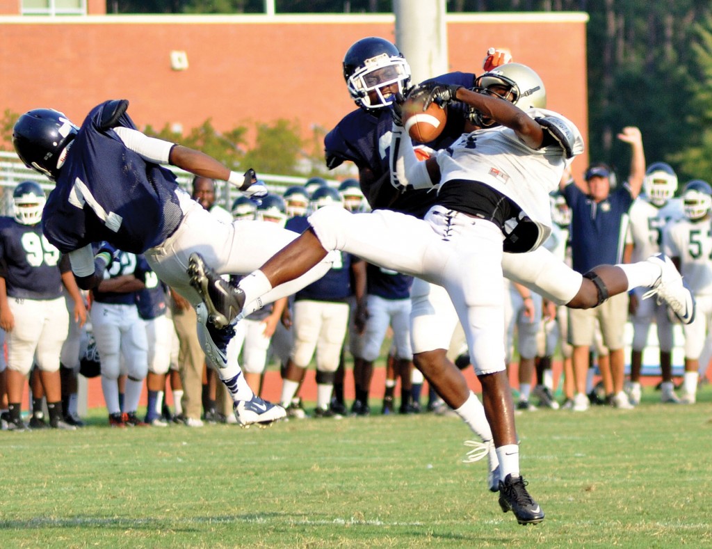 The Fairfield Central Griffins had their first taste of full contact last Friday as they traveled to Blythewood High School to scrimmage the Bengals. In a true defensive struggle, the 2A Griffins escaped with the 6-0 win over the Class 4A Bengals. Pictured: Kewaun Squirewell (white jersey) hauls in the pass and sends the defense flying.