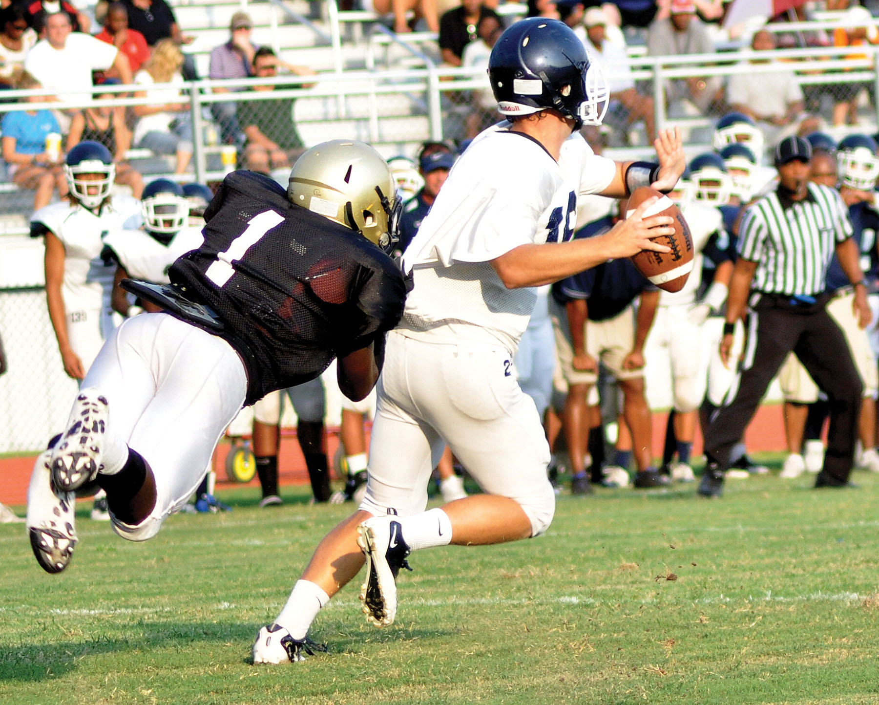 The Fairfield Central Griffins had their first taste of full contact last Friday as they traveled to Blythewood High School to scrimmage the Bengals. In a true defensive struggle, the 2A Griffins escaped with the 6-0 win over the Class 4A Bengals. Pictured: Raheim McDaniel on the loose again, this time harassing the Bengal quarterback.