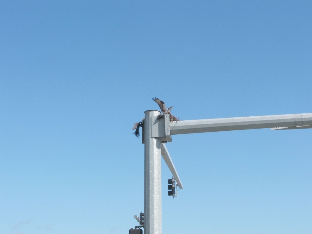 An interesting sight I saw on a recent trip to Florida was an osprey nest that had been built on top of a traffic signal at a very busy intersection. The interesting fact about this nest is that the osprey had been booted from her original nest by an owl. You might wonder how this could happen, since the adult osprey weighs close to 5 pounds with a wing span of 50 to 71 inches compared to the owl weighing in at 3 pounds with a wing span of only 40 to 60 inches.