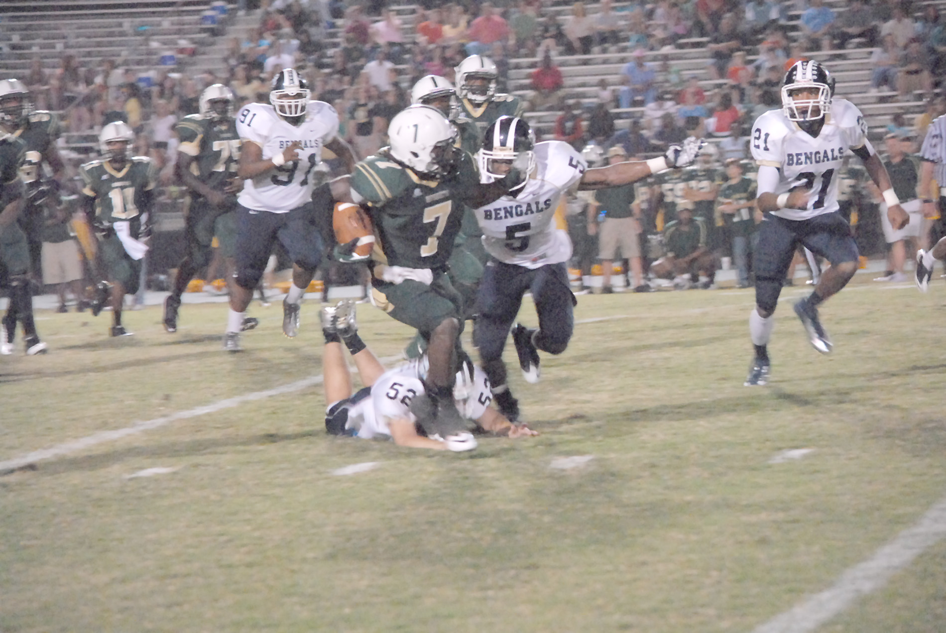 The Blythewood Bengals football team (5-1) flexed their muscles Friday night in Aiken (2-4), beating the Green Hornets 49-7. Blythewood moved up and down the field as they piled up the yardage for a season-high 423 total offensive yards. Aiken head coach Carey Johnson knew his defense had a tough task in front of them.