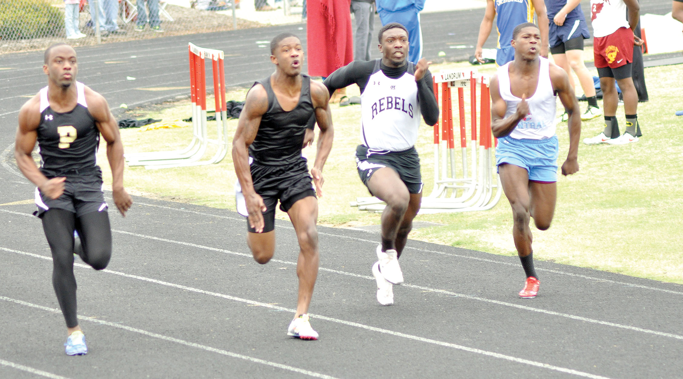Devonta Foster (second from left) races down the stretch in the boys’ 100-meters.