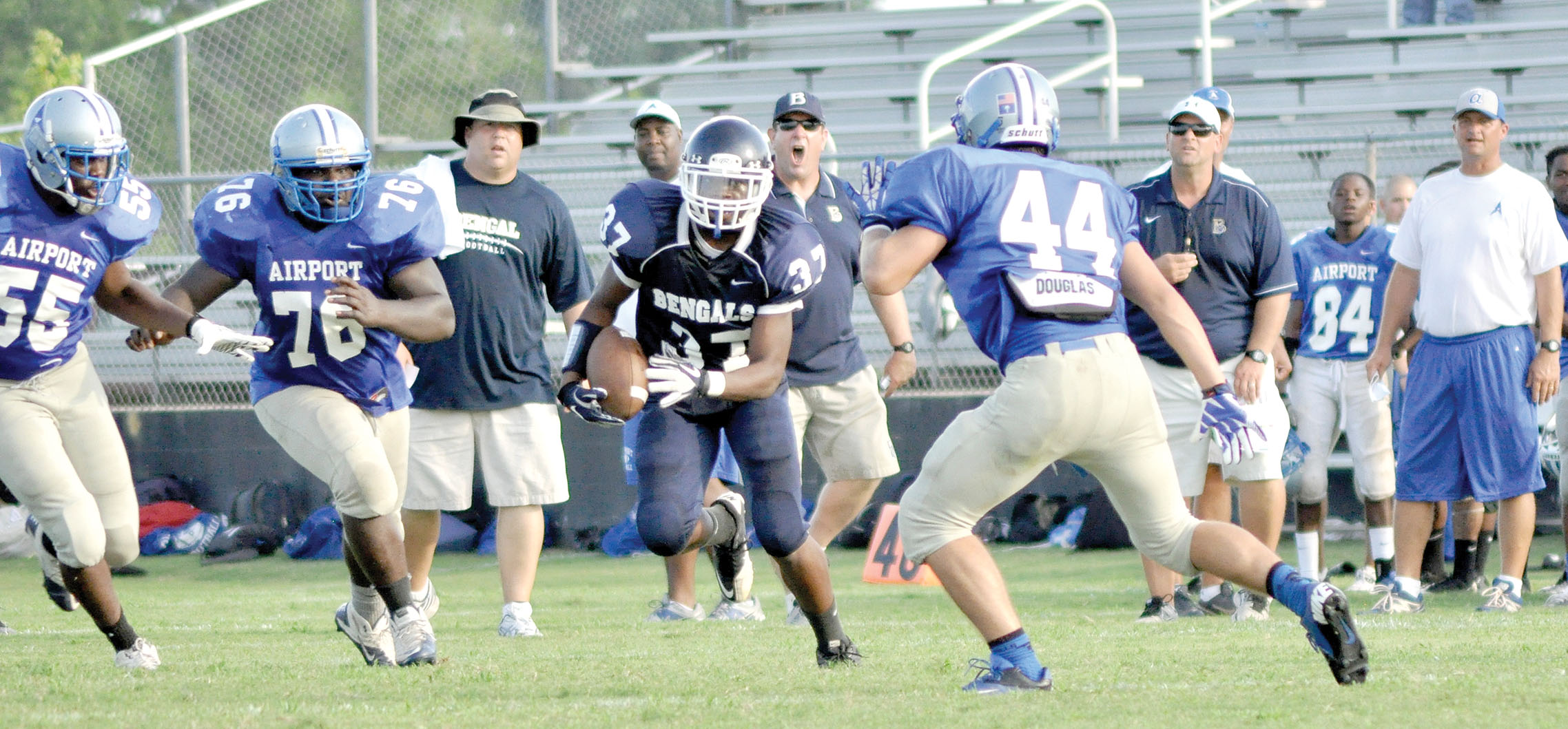 Blythewood’s Franklin Jordan (37) splits the Airport defense in game one of Friday’s four-way scrimmage.