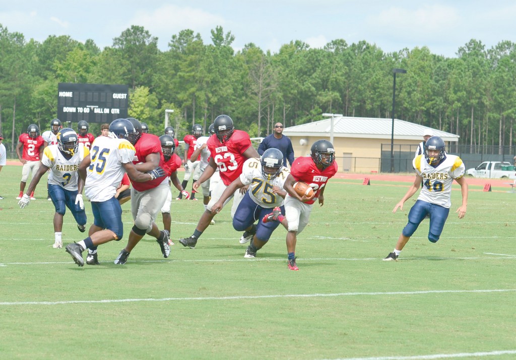 Westwood High School running back Kijuan Smith breaks through the Keenan defense and sprints for the goal line during last week’s scrimmage at Keenan. The Redhawks travel to Batesburg-Leesville Saturday (Aug. 17) for a 9 a.m. scrimmage and will play in the 9 p.m. slot Aug. 23 in the Lugoff-Elgin Jamboree.