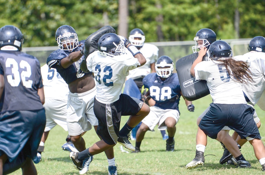 Blythewood’s Jalen Williams (dark jersey) delivers a morning jolt to Joseph Richardson during last week’s early workouts. Blythewood, Fairfield Central and Westwood high schools, as well as Richard Winn Academy, began summer workouts last week. Preseason begins tonight (Aug. 9).