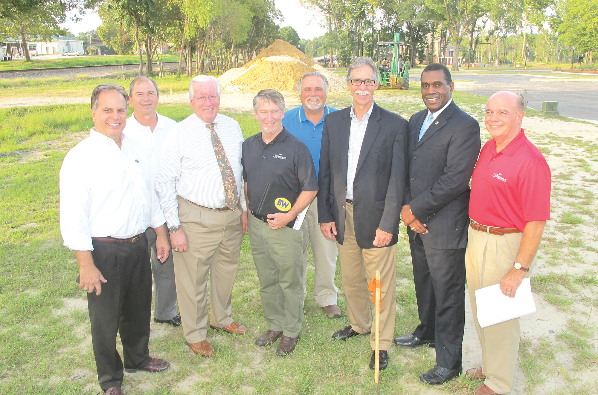 Standing at the corner stake where the Doko Restaurant will soon be built are Town Councilman Paul Moscati; Ed Parler, the Town’s economic development consultant; Town Councilmen Ed Garrison and Roger Hovis; Mayor J. Michael Ross; Jonathan Bazinet, owner of Sam Kendall’s restaurant in Camden; State Sen. Joe McEachern, president of the Blythewood Facilities Corporation and Town Administrator John Perry.