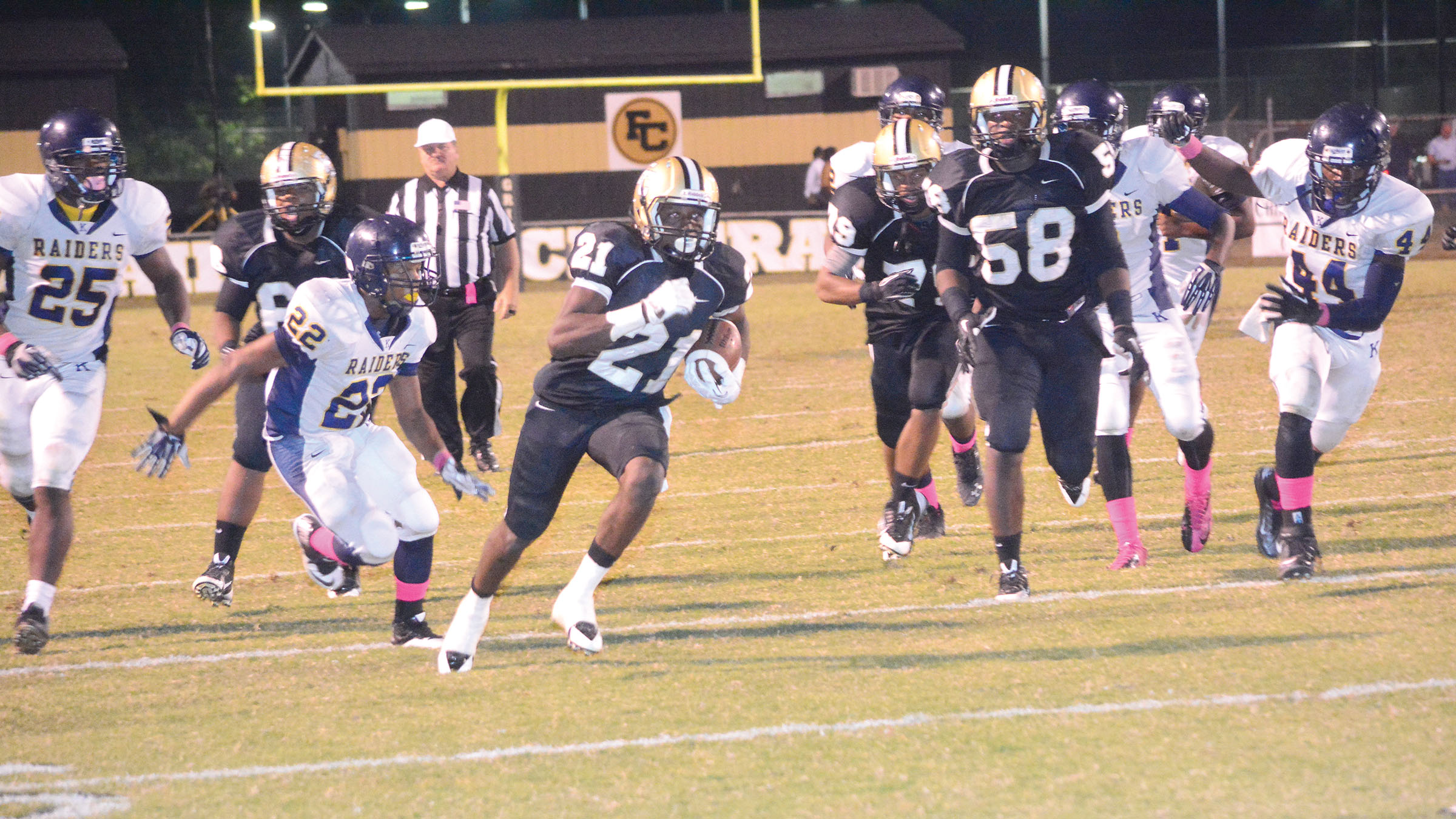 In spite of the interceptions, Belton threw for 195 yards and one TD against Keenan on Oct. 18, while the Griffin ground game chewed up 331 yards of offense. Larry G. Bell and Joseph Young each went over 100 yards, with 124 and 114 respectively. It will be no mystery for the Raiders as to what Fairfield Central’s formula for success will be – run the ball as much as possible until you can’t; then pass. Will their familiarity with the Griffin game plan earn dividends?