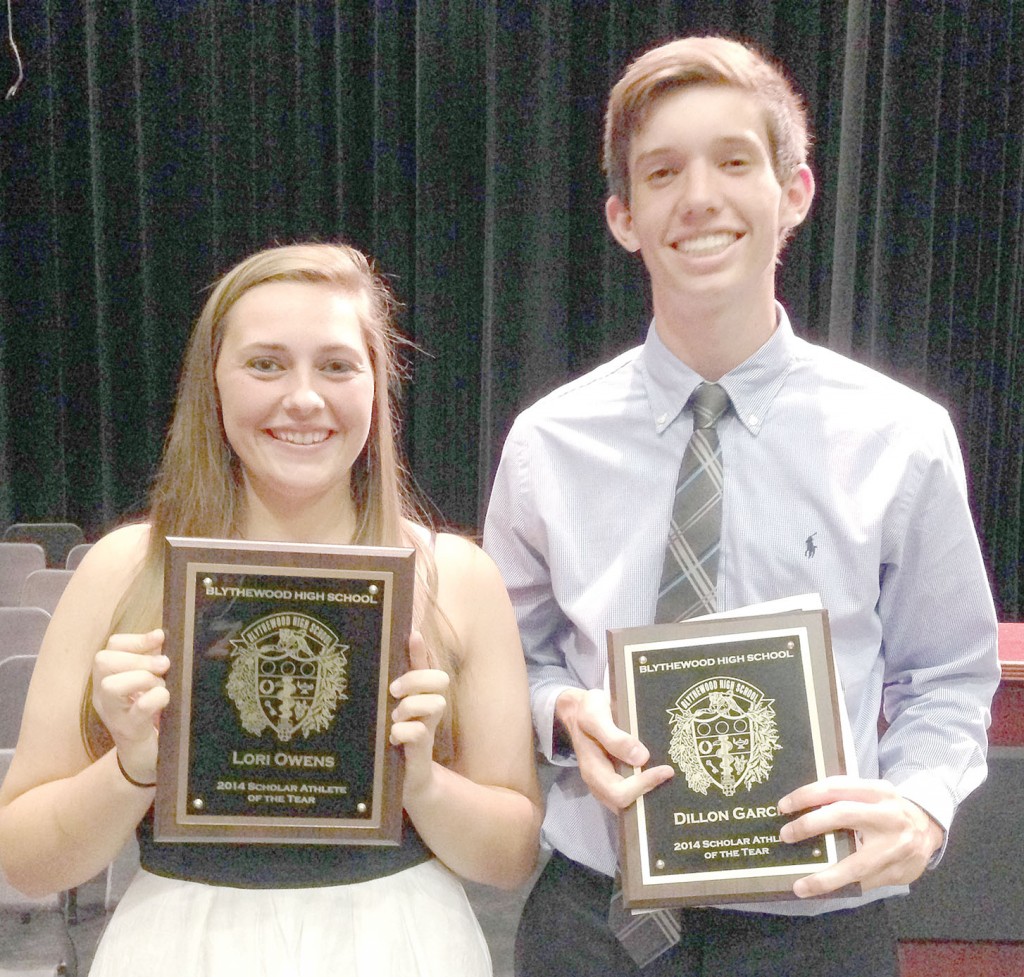 Blythewood High School softball player Lori Owens (left) and soccer player Dillon Garcia were recognized last week as the BHS Student-Athletes of the Year at the high school’s annual All-School Awards night.