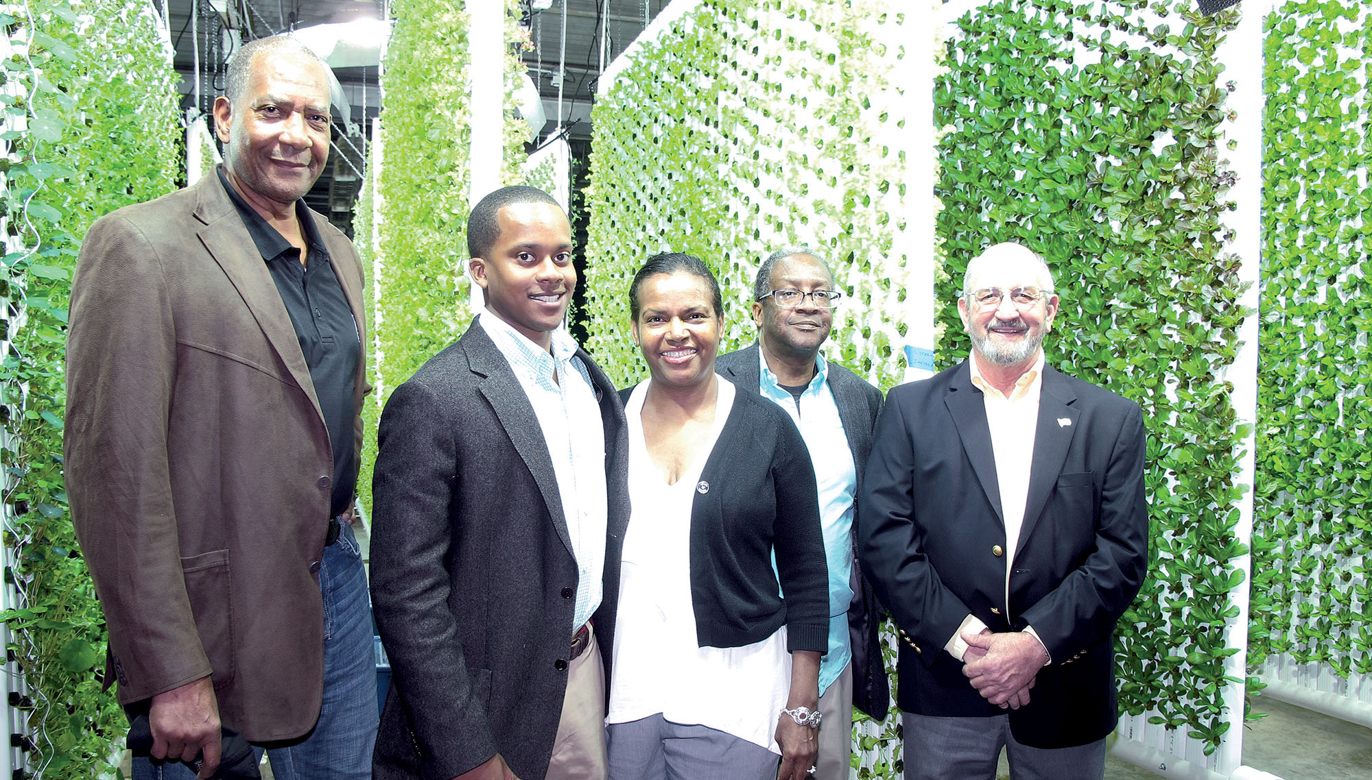Royal Greens, Ridgeway’s new wholesale/retail hydroponic plant business, opened its doors at 200 E. Church St. last week to a huge crowd including Alex English, left, and his wife Vanessa of Blythewood and Fairfield County Councilman Marion Robinson, right. With them are manager of operations Chip Harriford, next to Robinson, and his son Scott. The Charm building, which houses the growing operation, will be the national headquarters for the business that will supply greens and other organically grown vegetables to Whole Foods, U.S. Foods, Sysco and other food stores and suppliers.