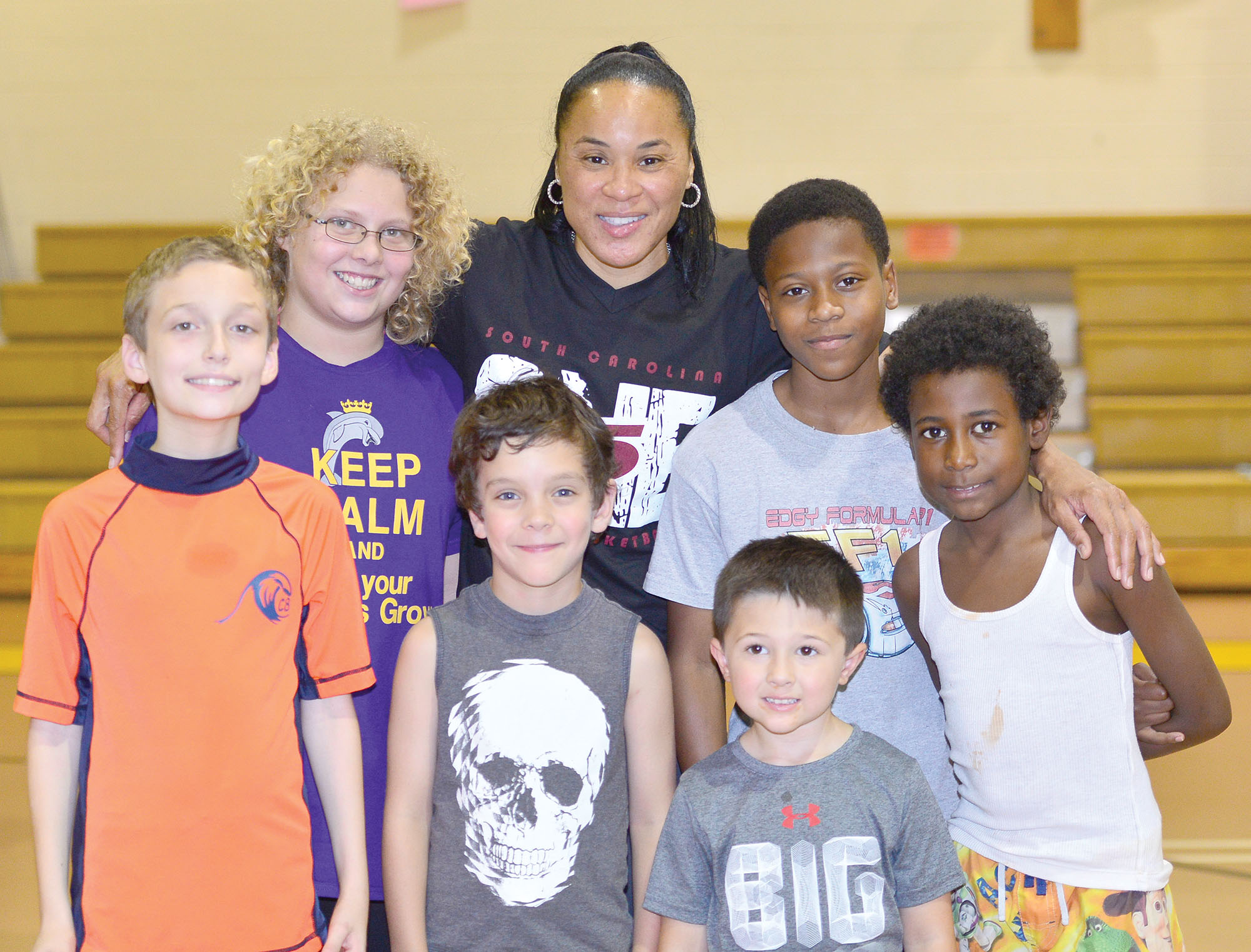 University of South Carolina women’s basketball coach Dawn Staley made a surprise visit last week to the Fairfield County Sheriff’s 10th annual Kids Day Camp at Fairfield Magnet School and took time out during her visit with (clockwise, from right) John Thompson, Daniel Seibles, Rylan Dove, Jack Flood, J.T. Blair and Anja Demirtas.