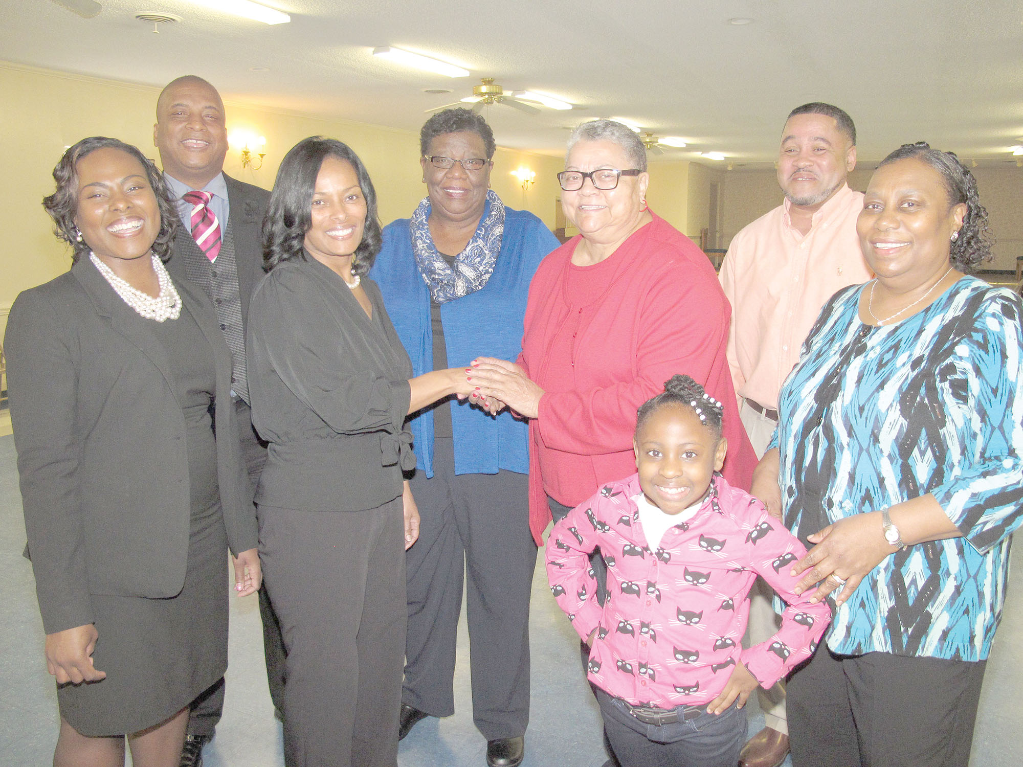 RIDGEWAY (Feb. 18, 2016) — Newly elected to the District 1 seat on the Fairfield County School Board, Sylvia Harrison, third from left, held a Meet & Greet for her constituents recently at Purity Lodge in Ridgeway. Harrison’s daughter, Monique McDaniels, left, and her husband Walter McDaniels assisted with the reception as Harrison greeted constituents Bessie Edwards; Joyce Dean; R’Moni Dean, 8; Moses Taylor and Delores Evans. Harrison took the oath of office in January and attended her first Board meeting Jan. 19.