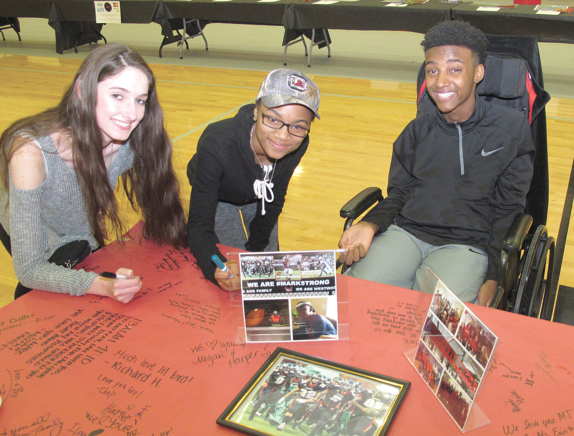BLYTHEWOOD (March 10, 2016) — During a benefit on Saturday for injured Westwood High School football player M.J. Mickens, right, his fellow students Delaney Woodam and Jada Wilson sign their good wishes for M.J.