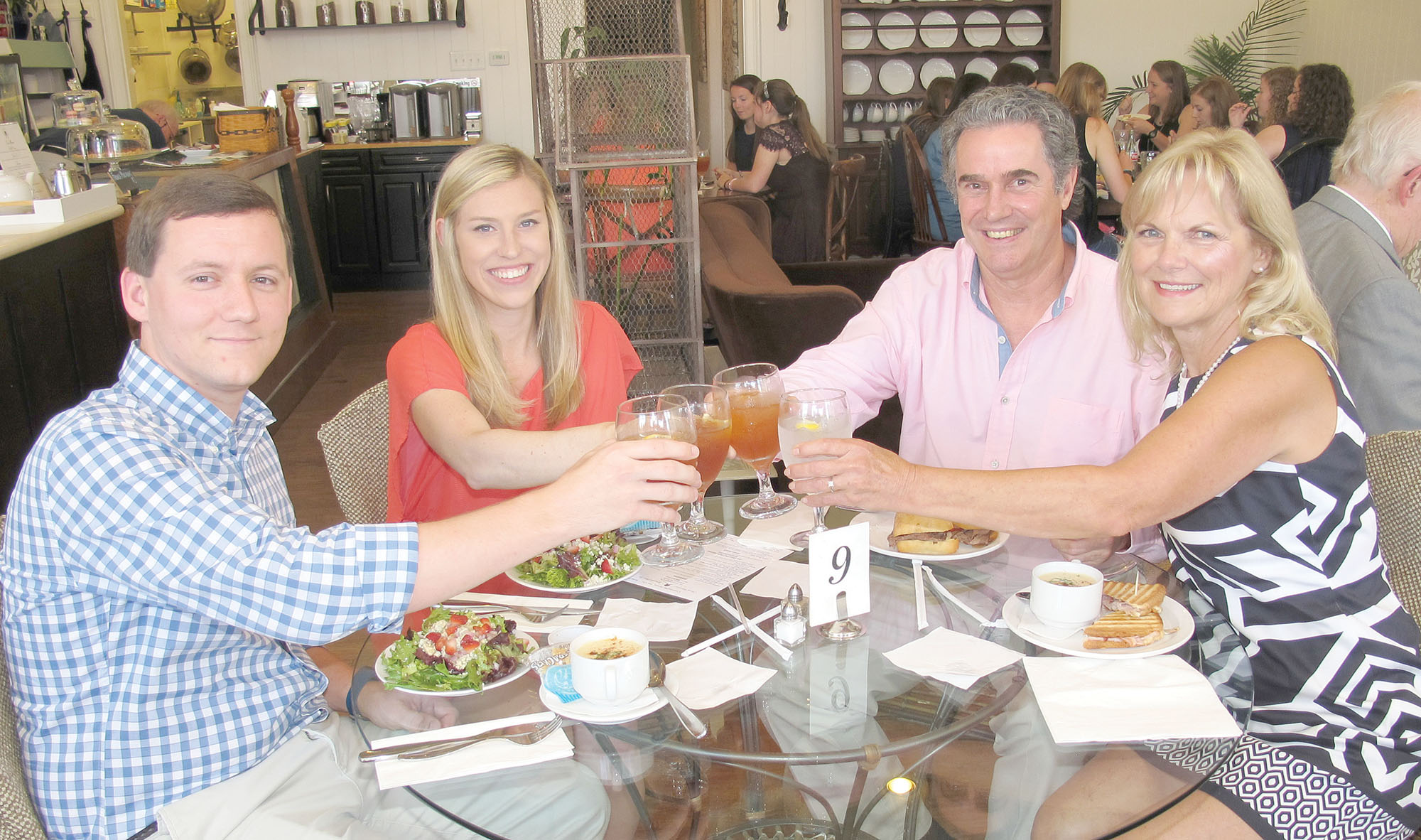 County Councilmen Billy Smith and Dan Ruff and their fiancees toast their engagements while having lunch in the Cornwallis Tea Room in downtown Winnsboro Sunday. Smith (Ieft) and Rachel Williamson haven’t yet set a date. Ruff and Brenda Clark will be married in September.