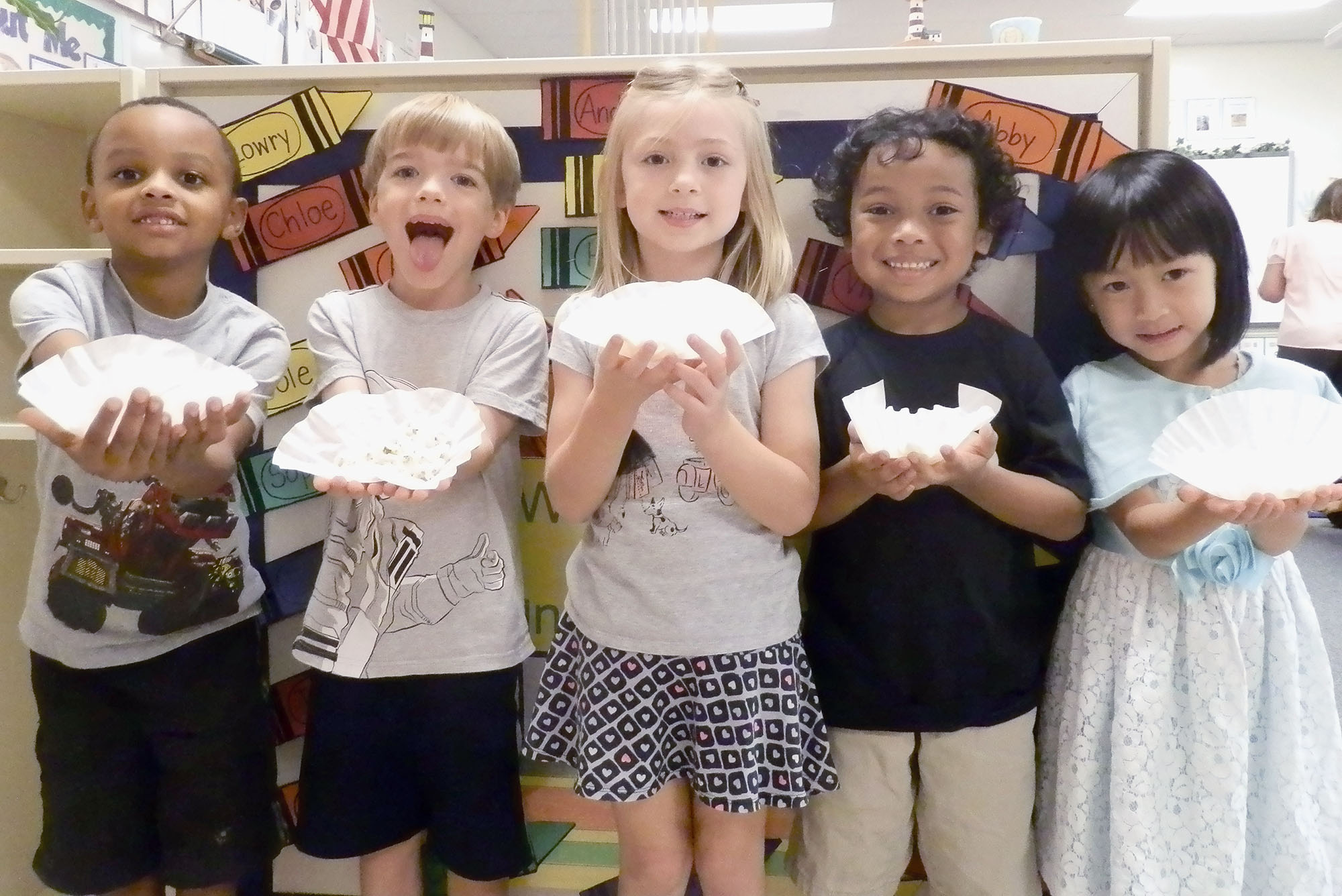 Kindergartners Andrew Baskin, Timmy Osesik, Abby Tabler, Elijah Ramos, and Phuong Vi Nyugen get ready to eat freshly popped popcorn. Joye Boswell’s kindergartners engaged in experiments throughout the week to learn how to identify objects using their five senses. Students cheered as popcorn started to bubble out of the popcorn machine.