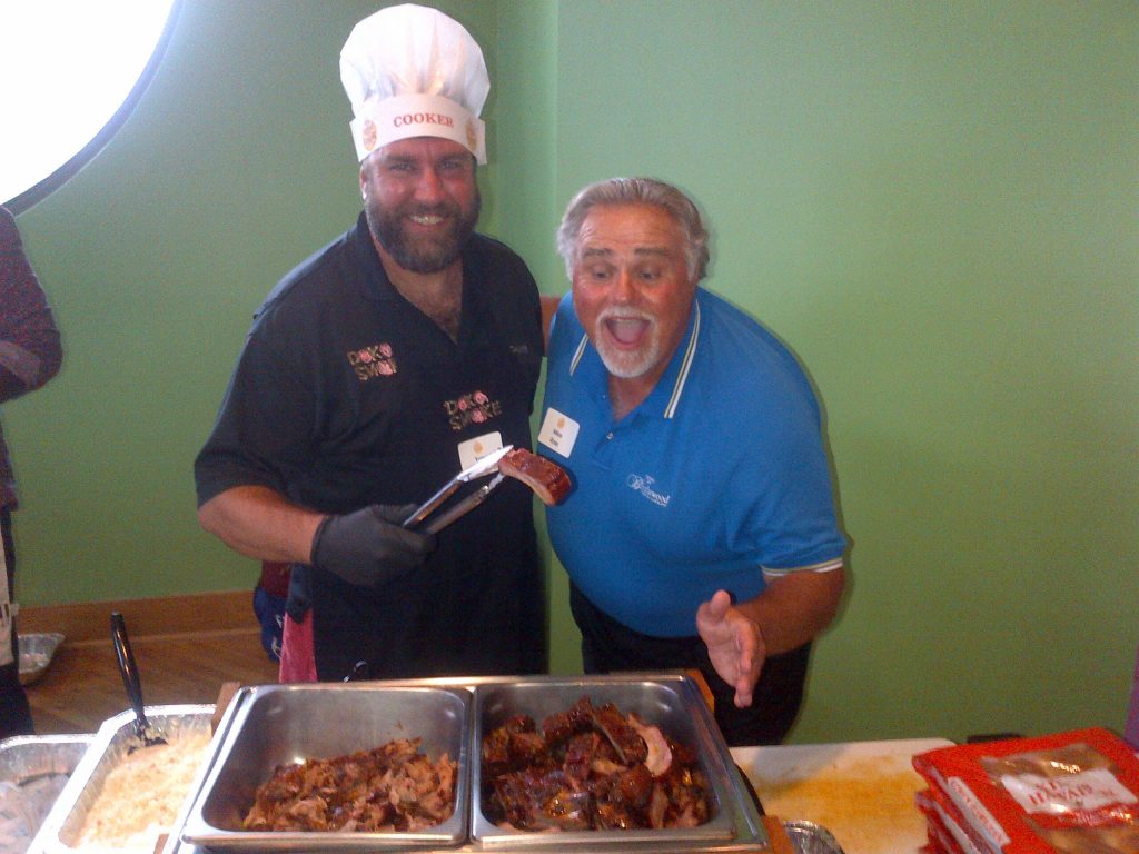 Mayor Ross and pit master Tony Crout sample their pork sliders.
