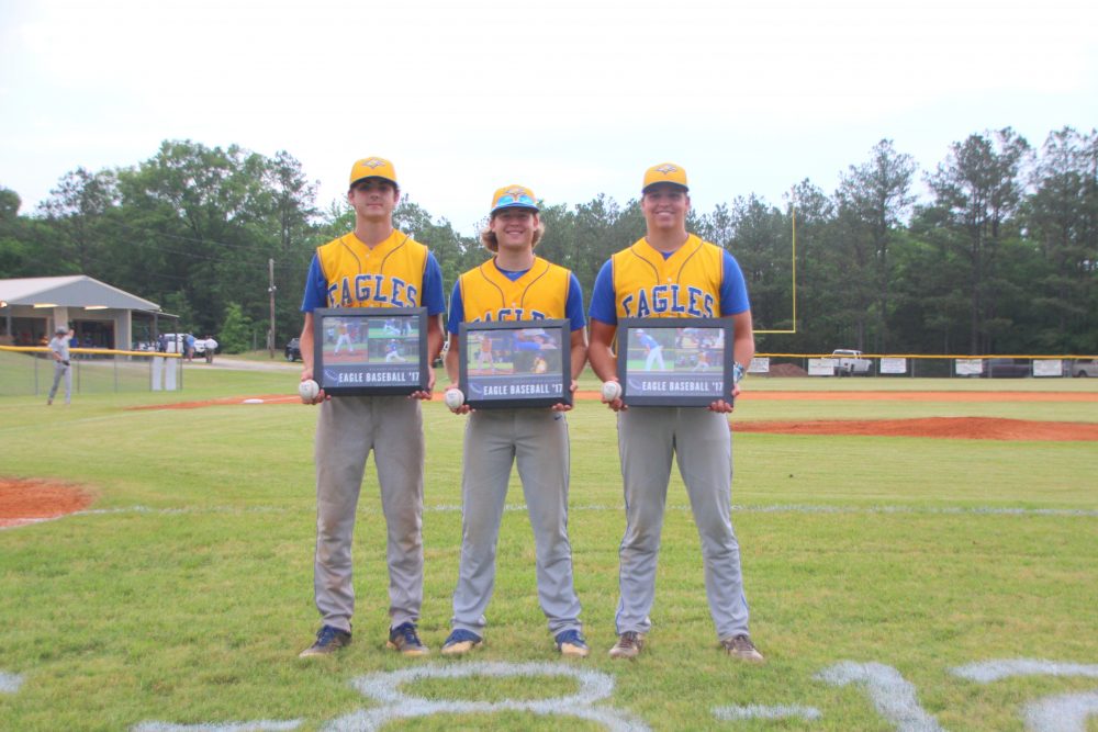 Bryant Carvalho (left), Tyler Douglas and Chris Christianson commemorate their last regular season home game during the team’s senior night. Photo/ Martha Ladd