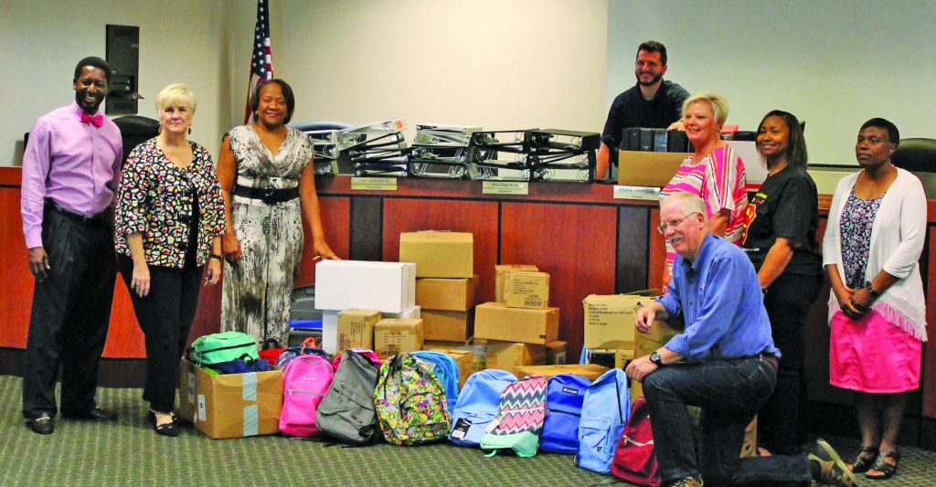 A school supplies drive spearheaded by the Fairfield Chamber of Commerce and the United Way was more than successful, according to Fairfield County Chamber of Commerce Director Terry Vickers. Organizing the notebooks, bookbags and other school supplies for distribution are, from left, Superintendent J. R. Green, Vickers, District Registrar Belva Bush, United Way representative Mike Quinn (kneeling), Ron Bosch and other staff members.
