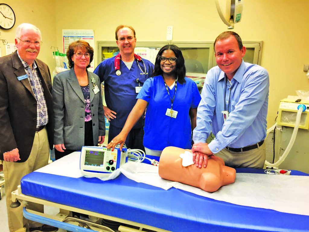 Pictured: Mike Quinn, FMH Foundation President, Suzie Doscher, FMH CEO, Dr.Thomas Hall, ER physician, Tiana Mitchell. Chief Nursing Officer, Jason Ferguson, Zoll representative, demonstrating the AED capabilities.