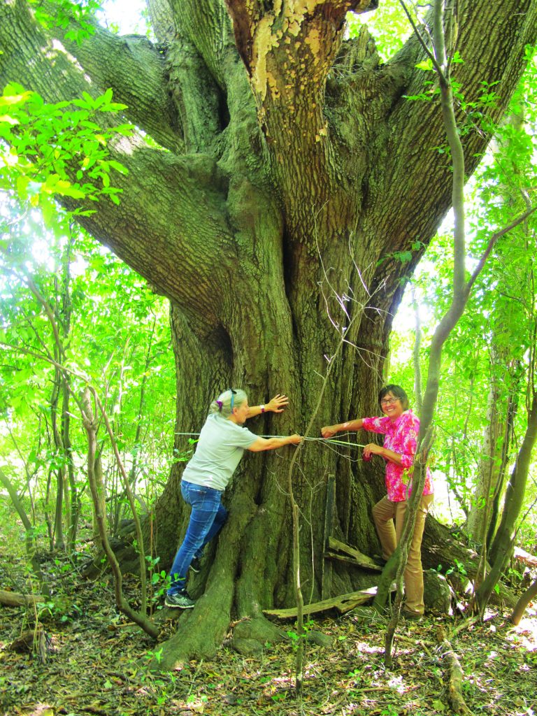 Suzanne Johnson, Volunteer Archivist and Exhibits Curator at Fairfield County Museum, left, and the museum’s Executive Director Pelham Lyles measure the circumference of a giant willow oak on private property off Peays Road in Winnsboro. With an 18 foot, one and a half inch circumference, the tree comes close to the tree in the state with the largest circumference of 22 feet.  Circumference is just one category in which trees are rated for size. Museum staff is currently researching whether the willow oak’s height and branch spread might qualify it as the largest tree in South Carolina.