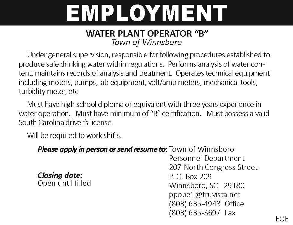 EMPLOYMENT: Water Plant Operator “B”, Town of Winnsboro