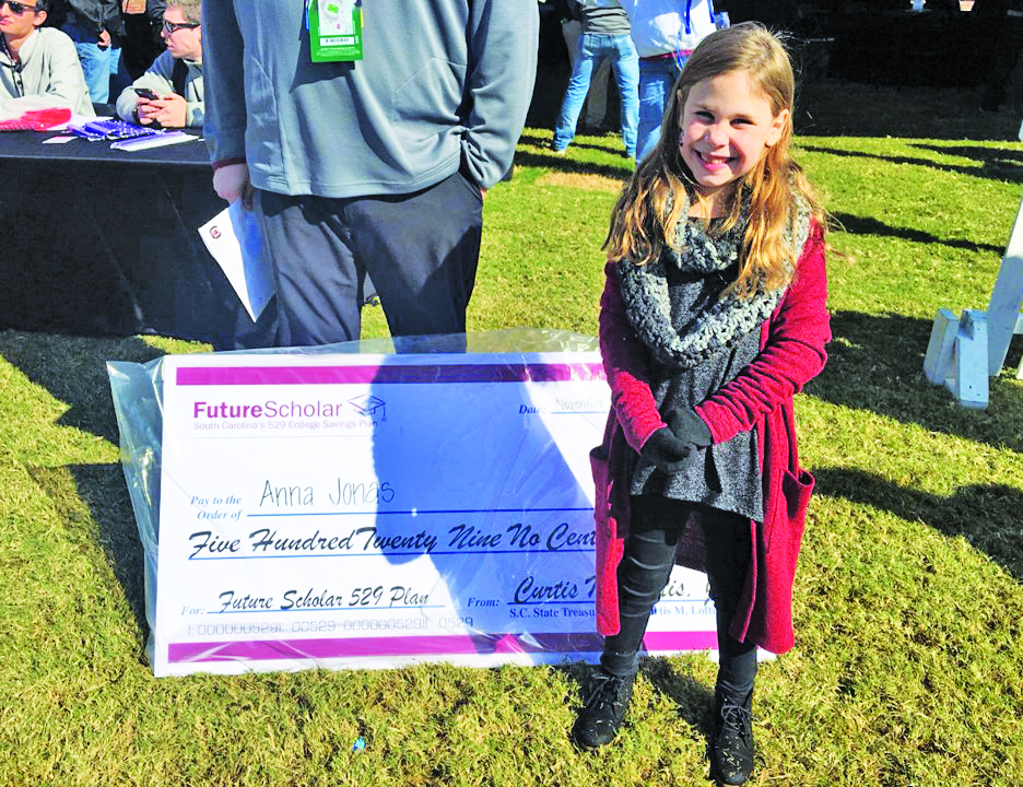 The Future Scholar Holler Sweepstakes awarded University of South Carolina football tickets, autographed memorabilia and $529 in Future Scholar college savings to Anna Jones, second grade student at Fairfield Elementary School.