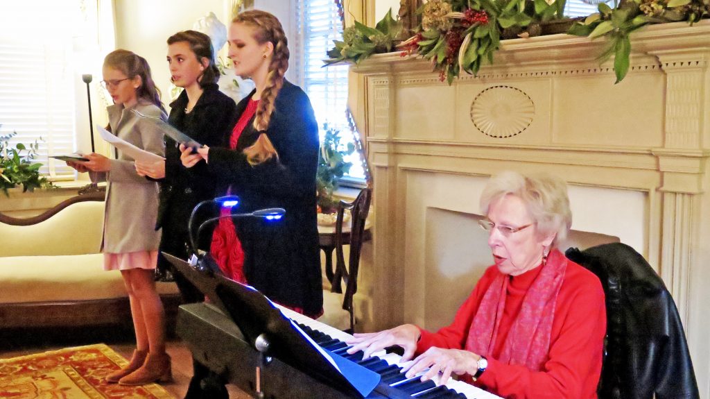 In the parlor, traditional holiday music was provided throughout the evening by local musicians including Laurens Livings accompanying her voice students and the Douglas Family singing carols.