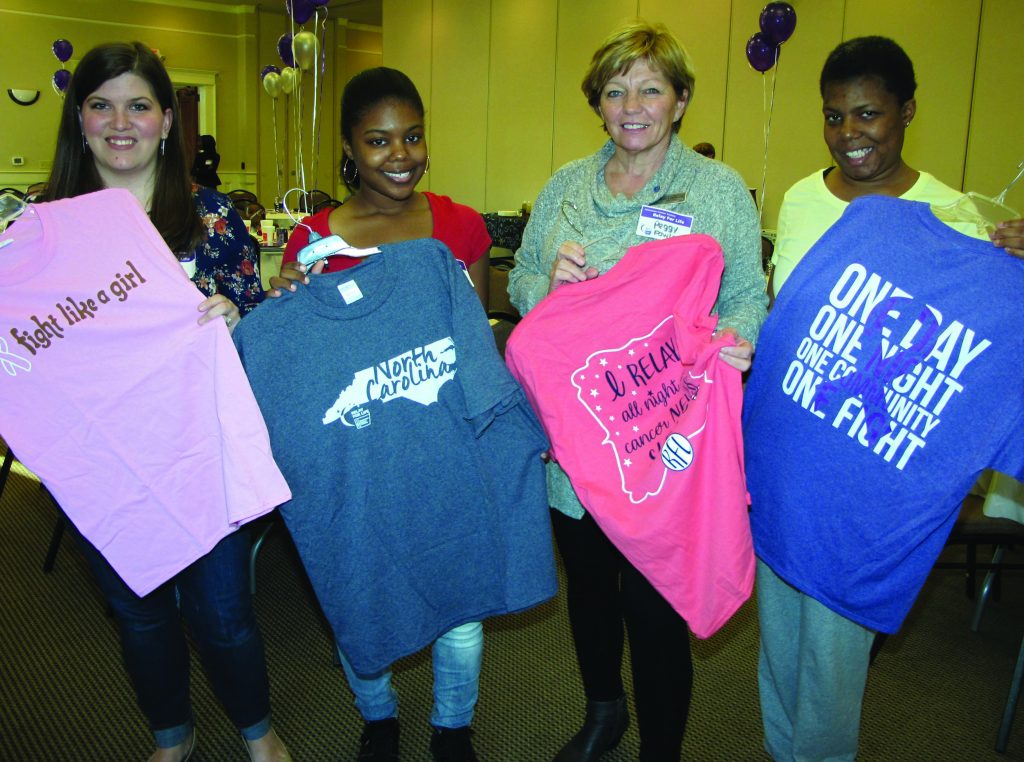 BLYTHEWOOD – Displaying some of the t-shirts available for the Relay For Life campaign (from left), Alex Oliver, Jessica Owens, Peggy Fowler and Jasmine Owens attended the Doko Manor kickoff for the May event for a reason: Oliver, for her son who has leukemia; Jessica Owens, for her mom, Jasmine, a cancer survivor; Peggy Fowler, for her parents who both died of cancer and cancer survivor Jasmine Owens, to support the fight against cancer.