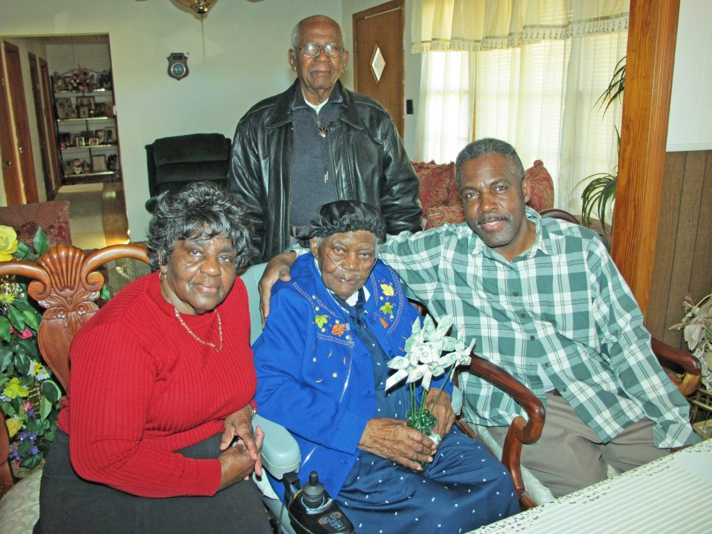 WINNSBORO – Mrs. Etta Williams, center, celebrated her 105th birthday last Thursday with her daughter, Ruth Davis, left; brother Robert Washington, 94, and grandson Randolph