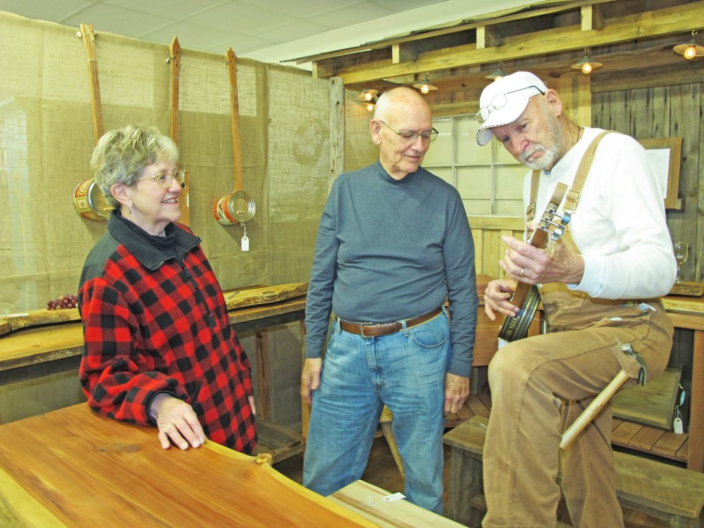 Oldies & Goodies shop owners Bobbie and Robert Pemberton enjoy the tin-can guitar entertainment provided by consigner Johnny Frick, right. | Photos/Barbara Ball