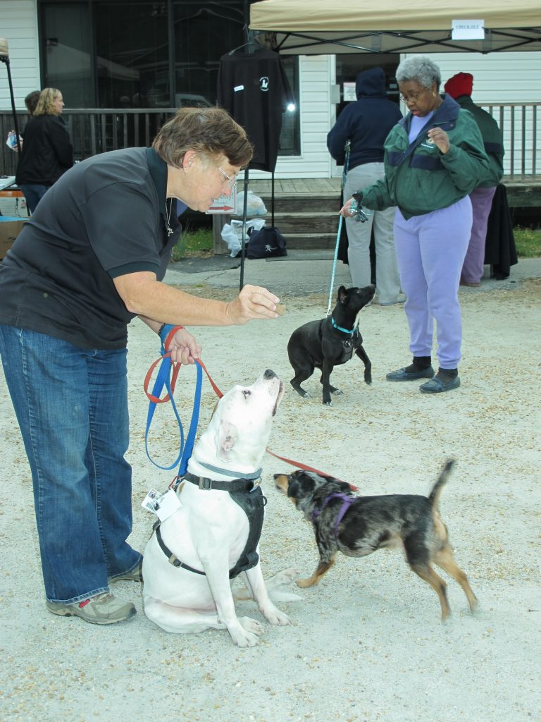 BLYTHEWOOD – Cindy Morgan and her rescues Lucy (sitting) and Riley stopped by MAFIA’s annual Spring Heartworm Clinic at Groomadog on Saturday for their heartworm tests and a supply of heartworm preventative.