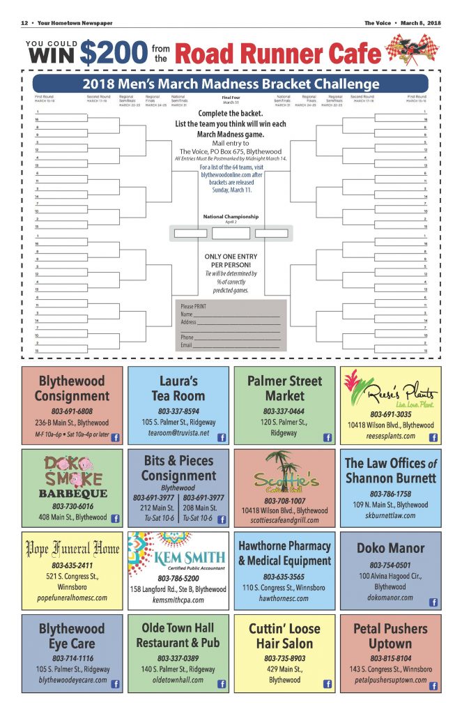 Complete The Voice’s fillable March Madness bracket on page 12 of our March 8 edition for your chance to win $200 from Road Runner Cafe! Only one entry per person, and entries must be postmarked by March 14.
