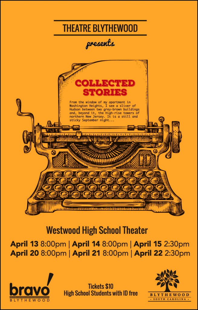 BLYTHEWOOD – Actors Rhythm McCarthy plays the role of Ruth Steiner and Amy Brower plays Lisa Morrison in Collected Stories, the first stage production of Theatre Blythewood, being performed at Westwood High School Theater. In the Pulitzer-nominated play, Brower’s character writes a novel based on McCarthy’s affair with the poet Delmore Schwartz. The women deal with the moral dilemma of whether a person’s life events are suitable for another to use in their own creative process. The play continues April 20, 21 and 23.