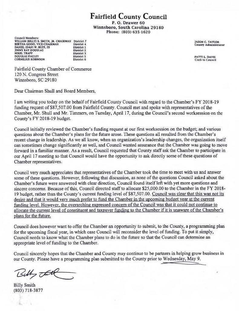 The Chamber is funded primarily by the County, at $87,500 annually, and by the Town of Winnsboro for Town sponsored events at $35,000 annually. In reference to the Chamber’s reported ‘limited financial support,’ County Council Chairman Billy Smith said he was surprised to hear that was a factor in the Board’s decision to go inactive.