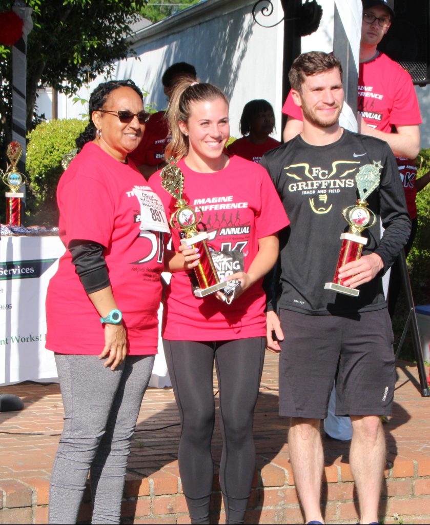 WINNSBORO – Fairfield Behavioral Heath Services Board Member Jannita Gason, left, gives awards to the 2018 Imagine the Difference Behavioral Health Services 5K overall winners for runners, Gabriella Sekowski, center, and Colby Coulter. The 21st annual 5K, which takes places each year during Alcohol Awareness Month, was held in downtown Winnsboro April 28. The event encourages community support for substance abuse prevention and promotes healthy lifestyles for the residents of Fairfield County.