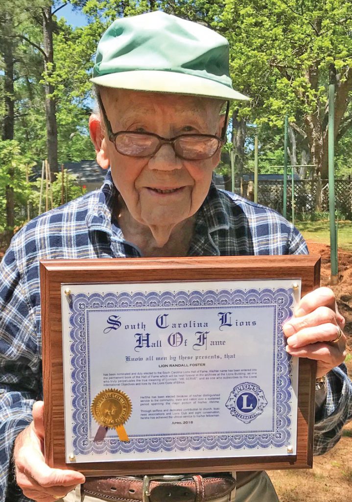 Winnsboro Lion Randall Foster was inducted into the South Carolina Lions Hall of Fame for his 61 years of service in the Winnsboro Lions Club. Foster, who chaired the Pancake Supper fundraiser for almost 50 years, was named SC Lion of the Year in 2012 and one of only 13 to be inducted into the Hall of Fame in 2018.