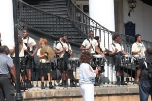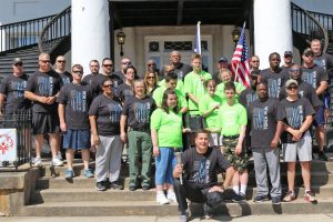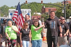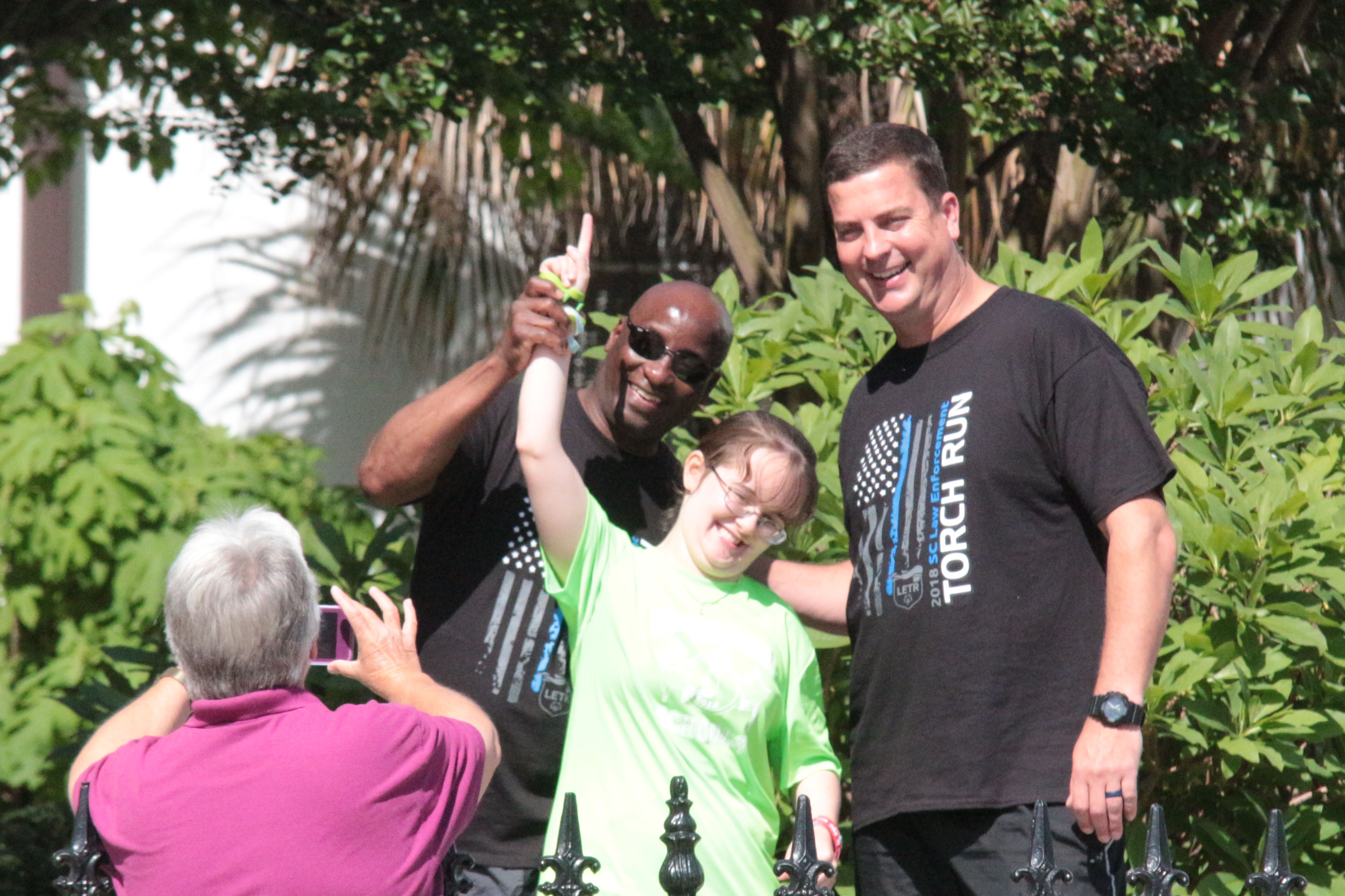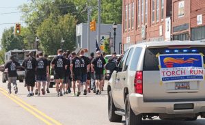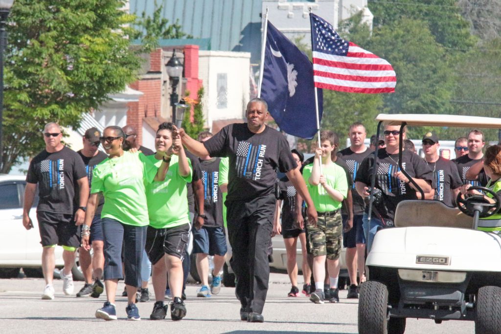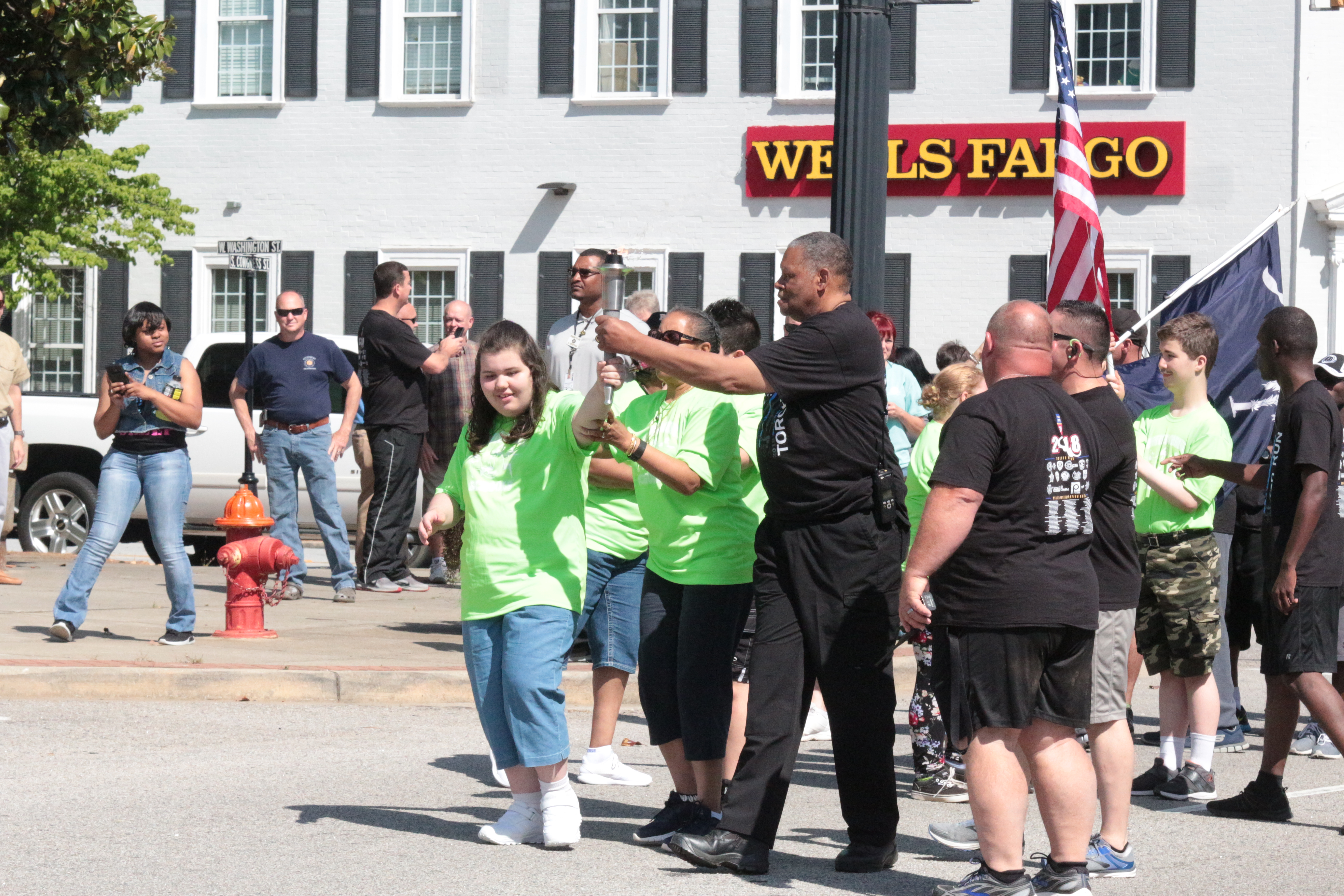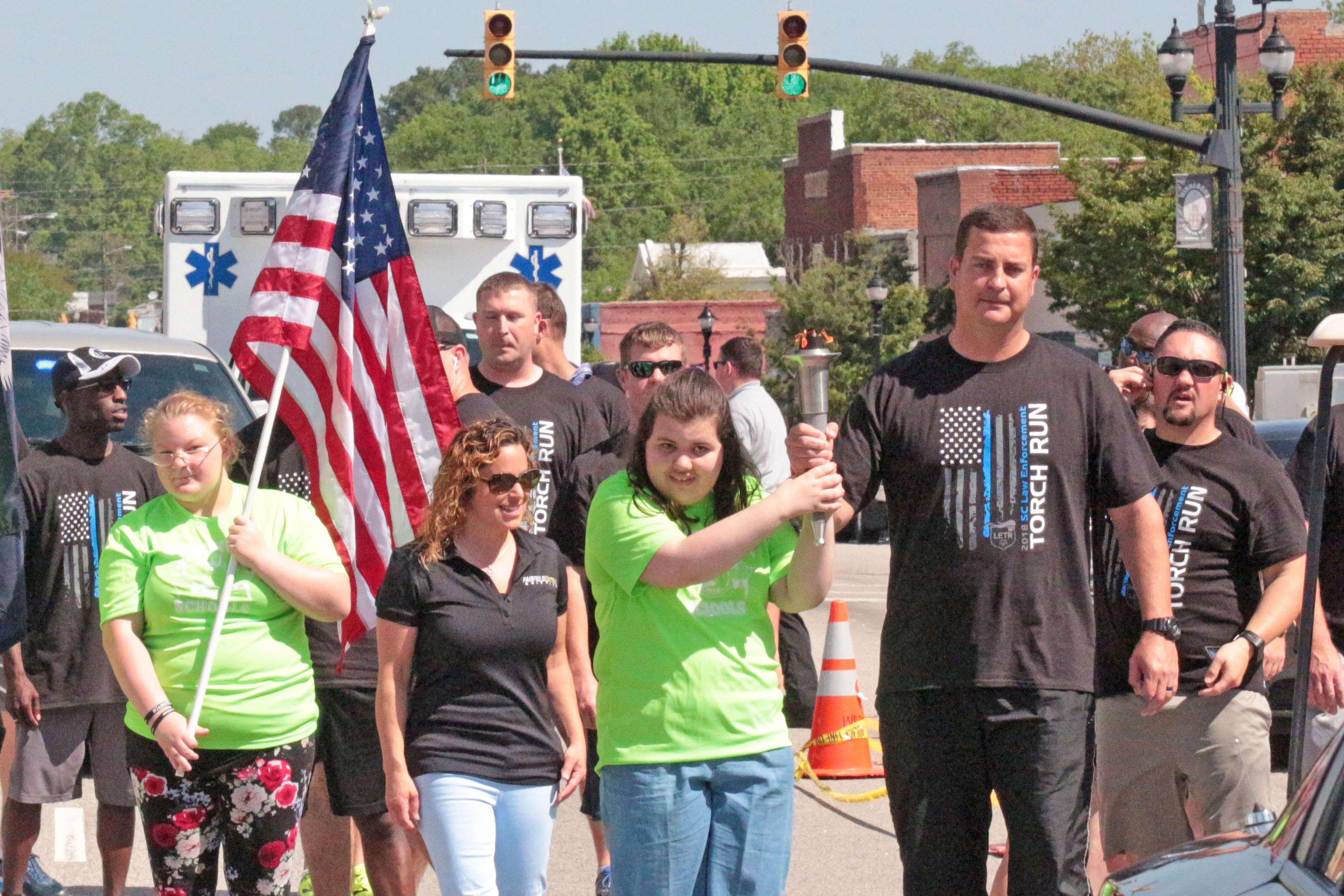 WINNSBORO – Fairfield County Sheriff’s Department, Winnsboro Department of Public Safety and other Fairfield County law enforcement agencies participated in the annual “County Line to County Line” S.C. Special Olympics Torch Run last Friday. Above, Winnsboro Police Chief John Seibles helps bring the torch down Congress Street to the courthouse, where it was passed to Sheriff Will Montgomery. Fairfield County athletes proudly carried the torch with law enforcement.