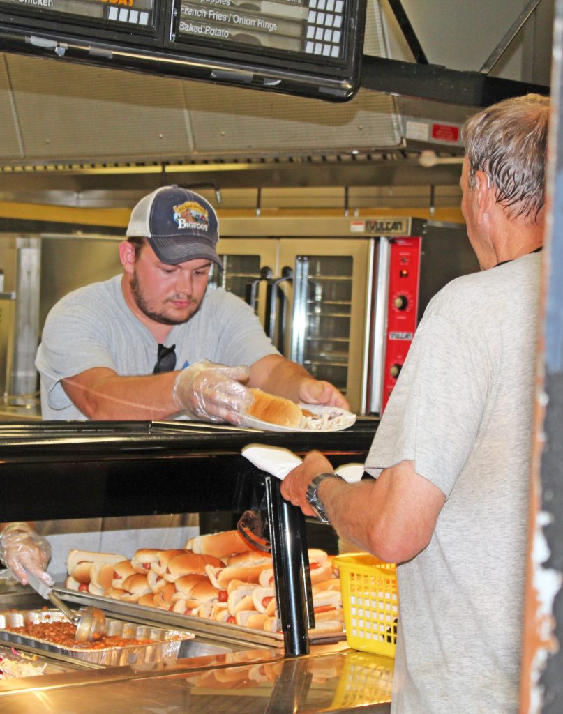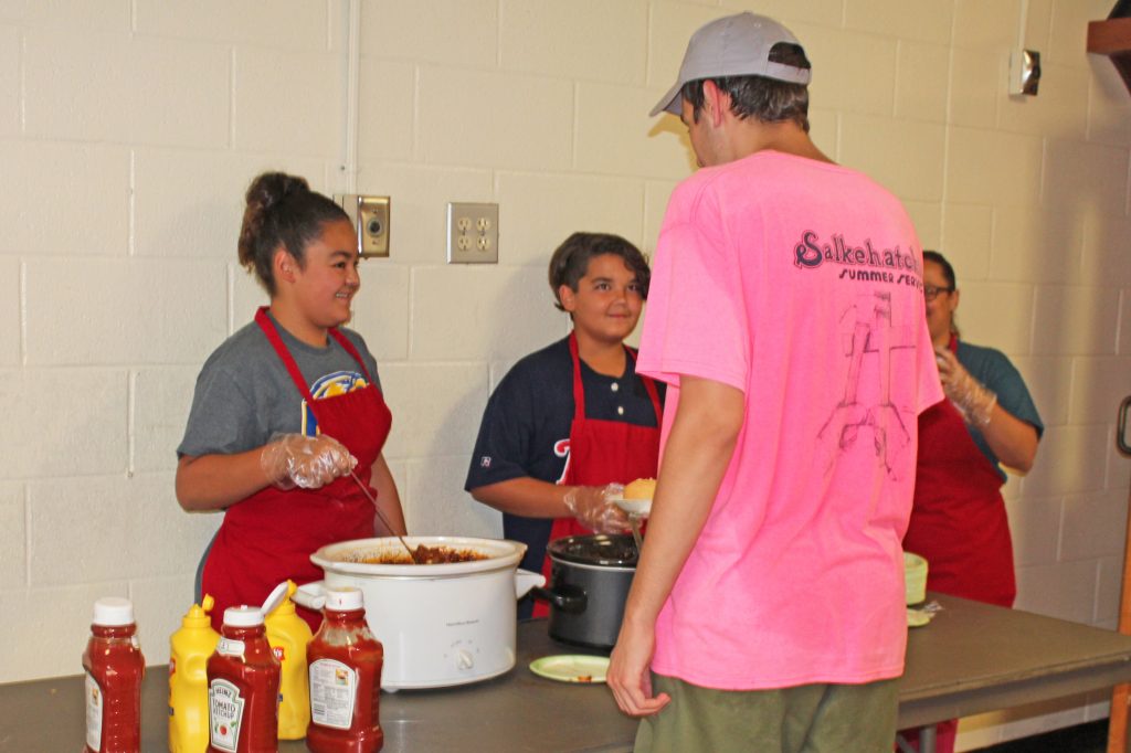 On Monday, representatives from St. John’s Episcopal, Sion Presbyterian and Salem Presbyterian churches fed Salkehatchie workers. Pictured above, Lily and Roman Hawkins, youth from St. John’s, serve chili. At right, Sion Presbyterian member Austin Costenbader plates hotdogs.