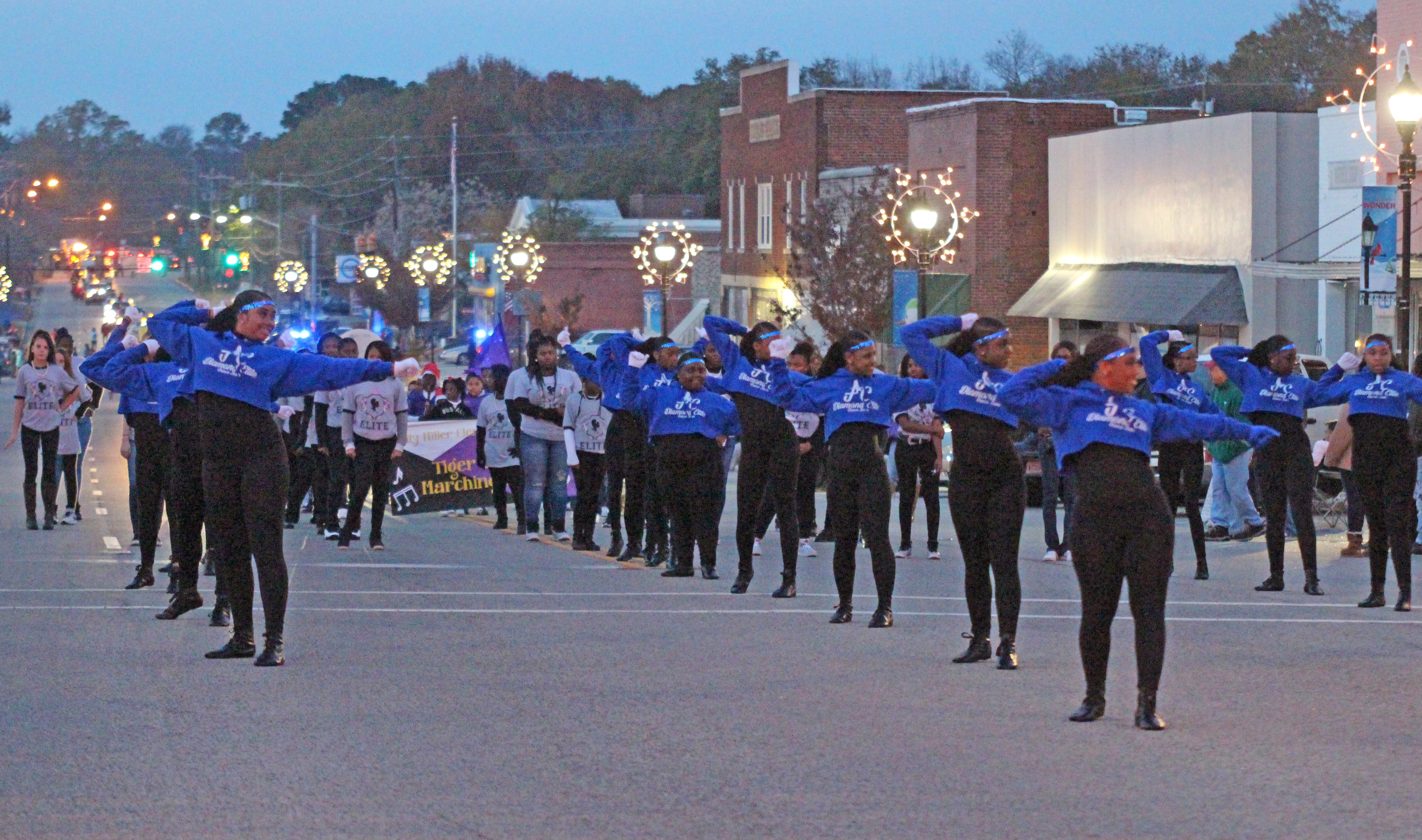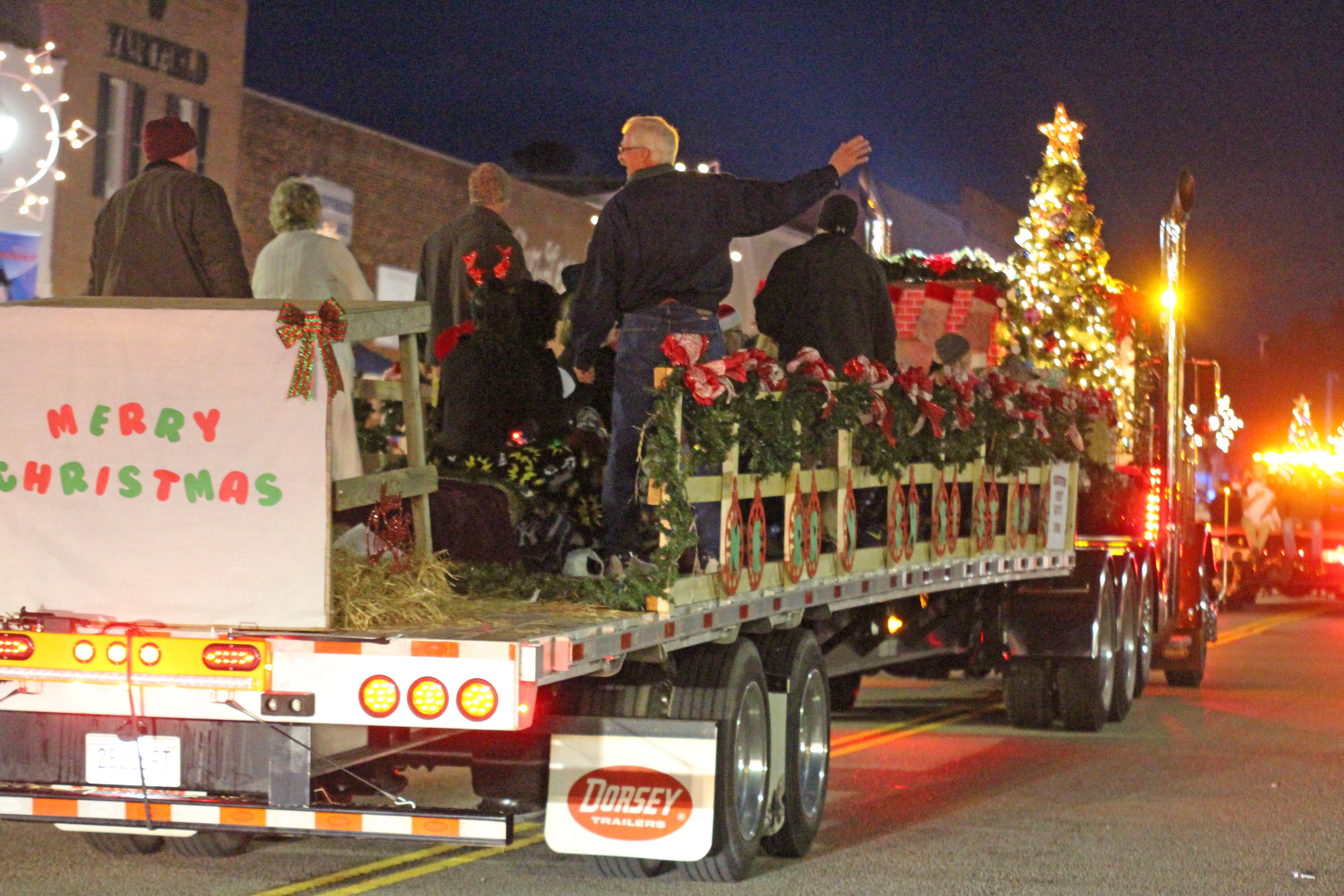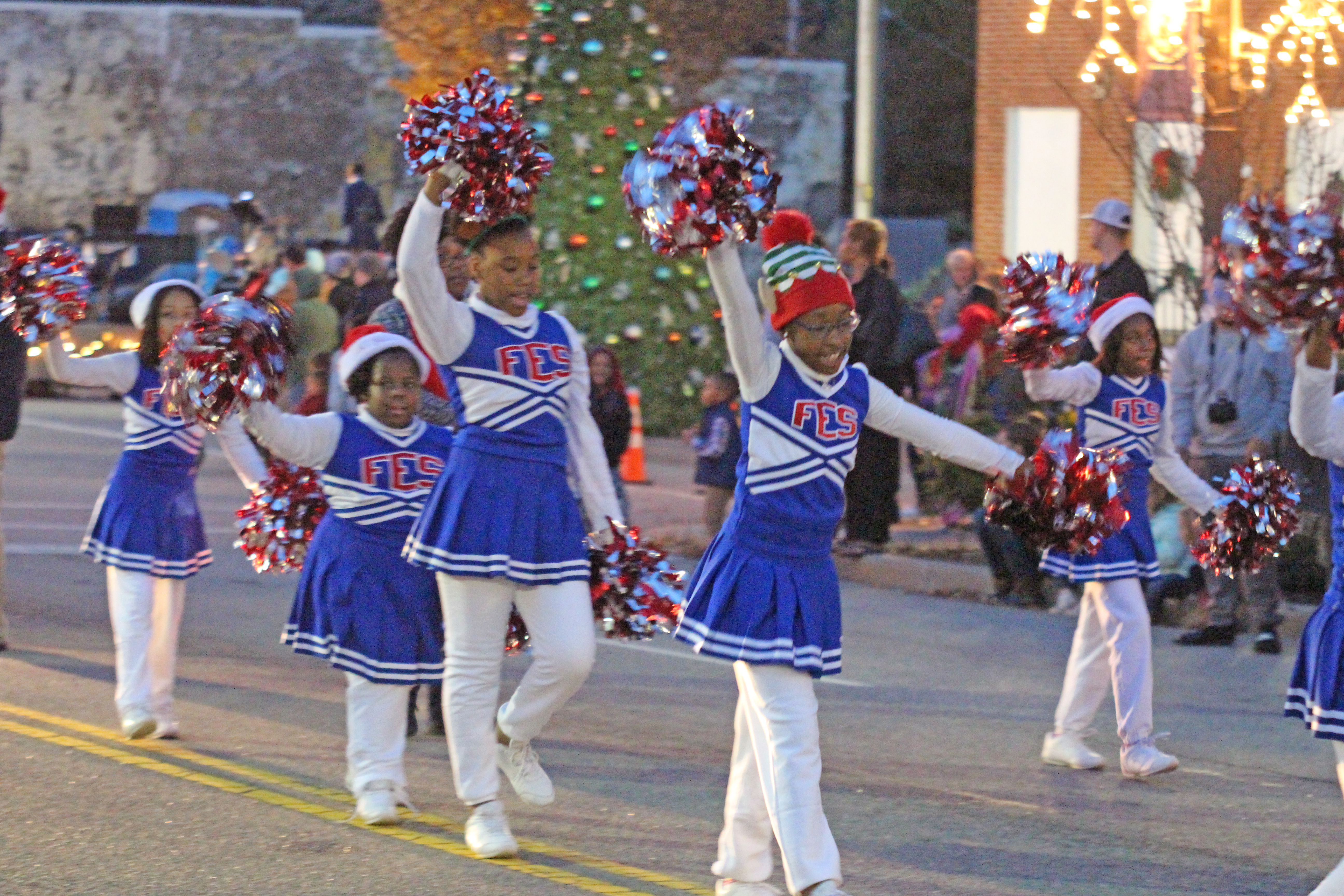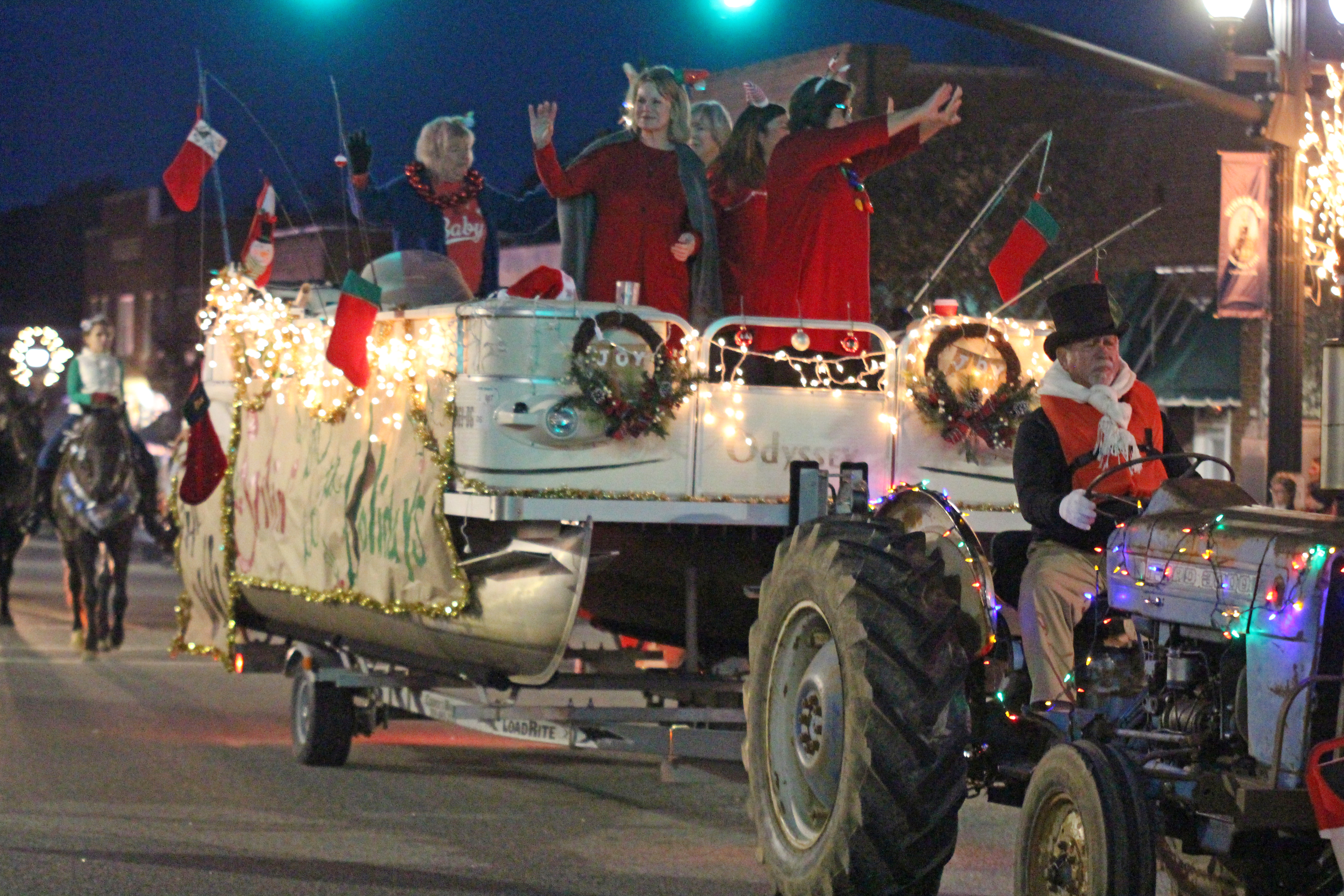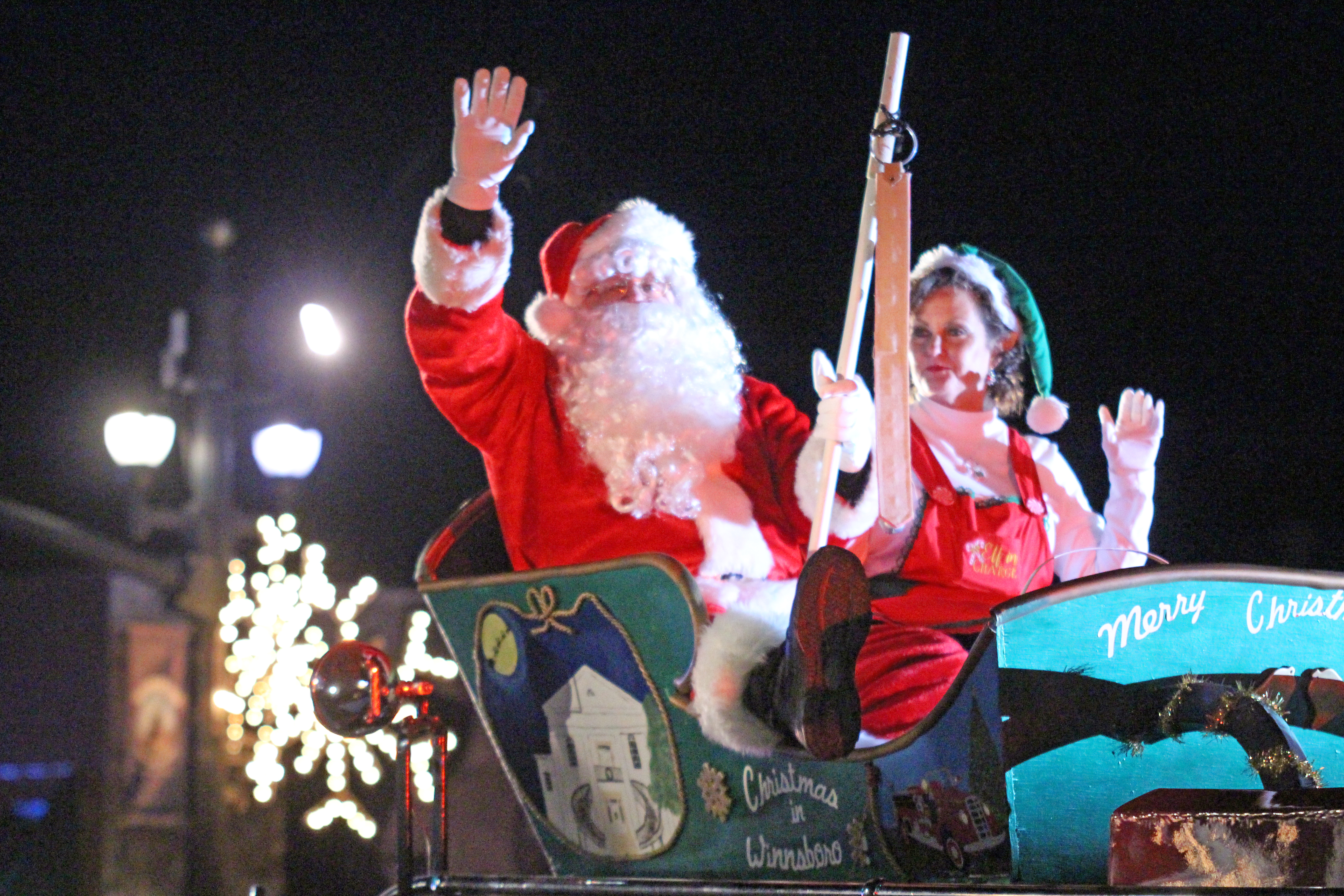 Santa and his elf wave to the crowd gathered for Winnsboro’s evening Christmas Parade on Sunday.