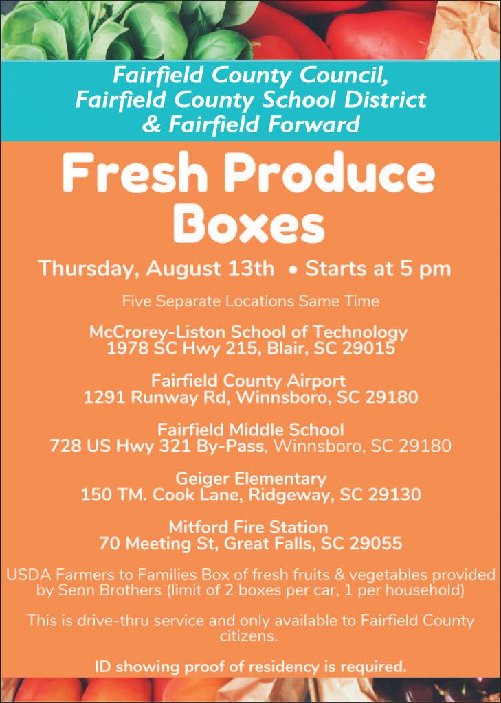WINNSBORO – The sixth Fairfield County distribution of free boxes of fresh produce is scheduled for distribution at five separate locations at the same time – Thursday, Aug. 13, at 5 p.m.