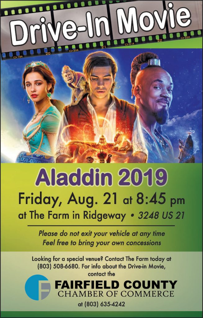RIDGEWAY – If you enjoyed The Lion King at the Fairfield Chamber of Commerce’s drive-in movie last month, you won’t want to miss Aladdin at the Chamber’s next drive-in movie to be held at The Farm in Ridgeway. This special venue offers a bucolic setting in the quiet countryside.