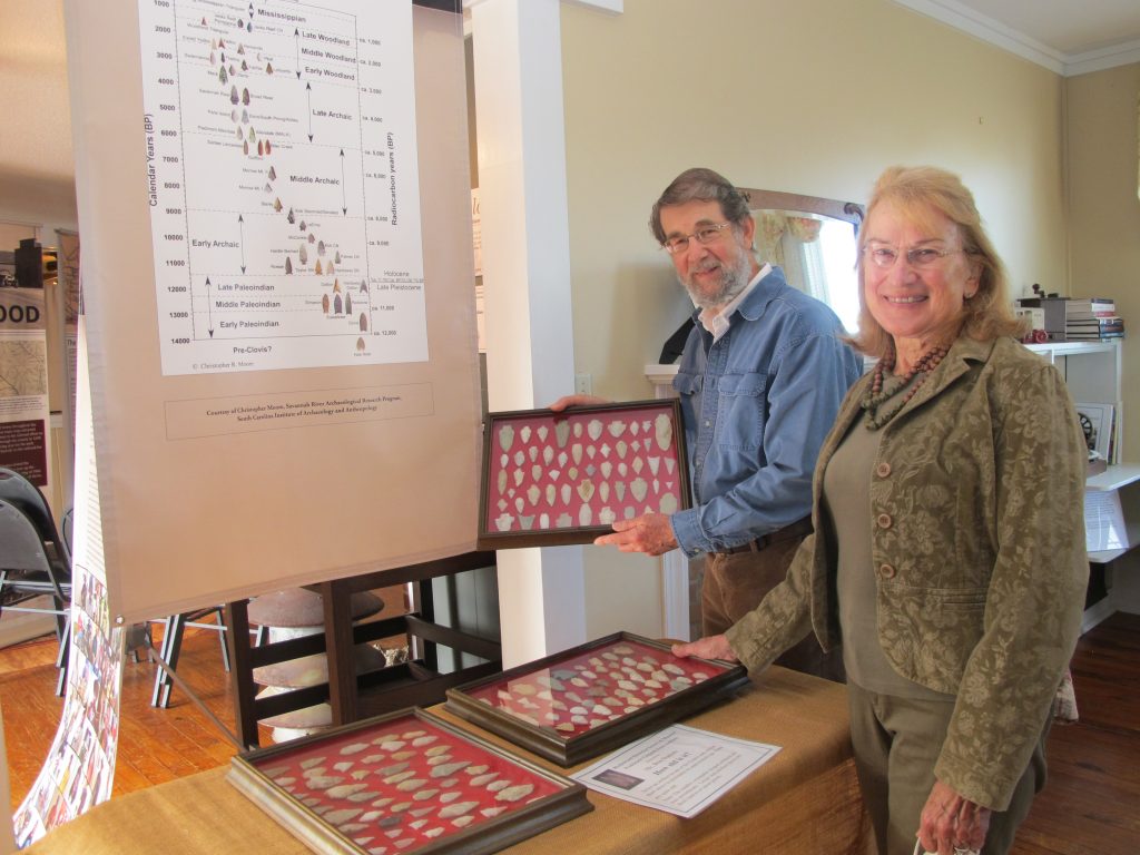Leland Ferguson, retired Director of the University of South Carolina department of archaeology shares information about a collection of SC arrowheads with Kitty Farnell, president of the Blythewood Historical Society.