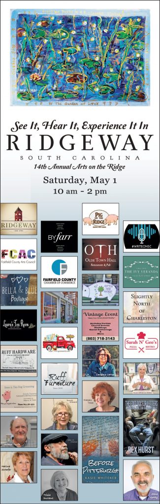 Event and merchant sponsors include:  Town of Ridgeway, ByFarr Designs, Pig on the Ridge, Write On SC, Fairfield County Arts Council, Fairfield County Chamber of Commerce, Olde Town Hall Restaurant, The Ivy Veranda, Bella & Blue Boutique, Palmer Street Market, The Cotton Yard Market, Laura’s Tea Room, Grandma’s Attic, Slightly North of Charleston, Sarah & Geo’s Pizza, Bows & Ties Pet Grooming, and Vintage Event.  Mary Chadwell’s ‘Ridgeway’ book will be on sale at Ruff Hardware and Ruff Furniture.