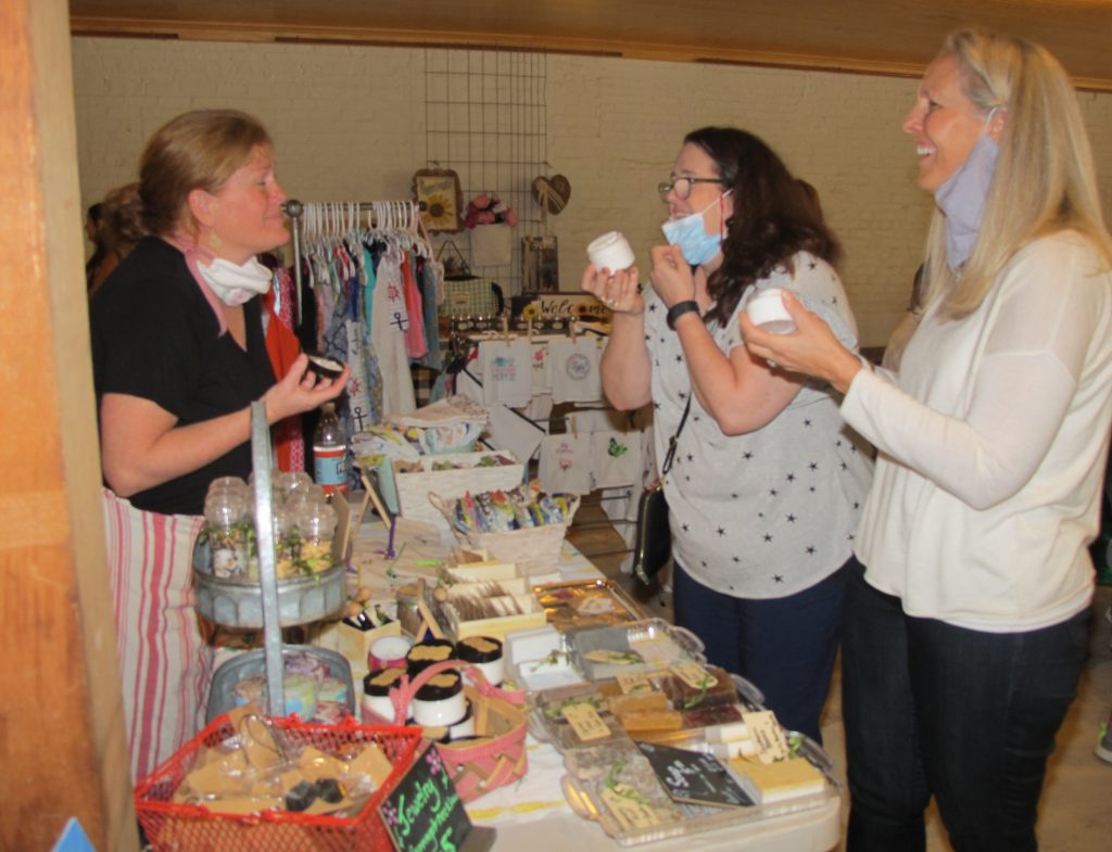 County Councilman Douglas Pauley and Jerrica Beam, owner of To Be Stitched register at vendor Caitlin Case’s booth.