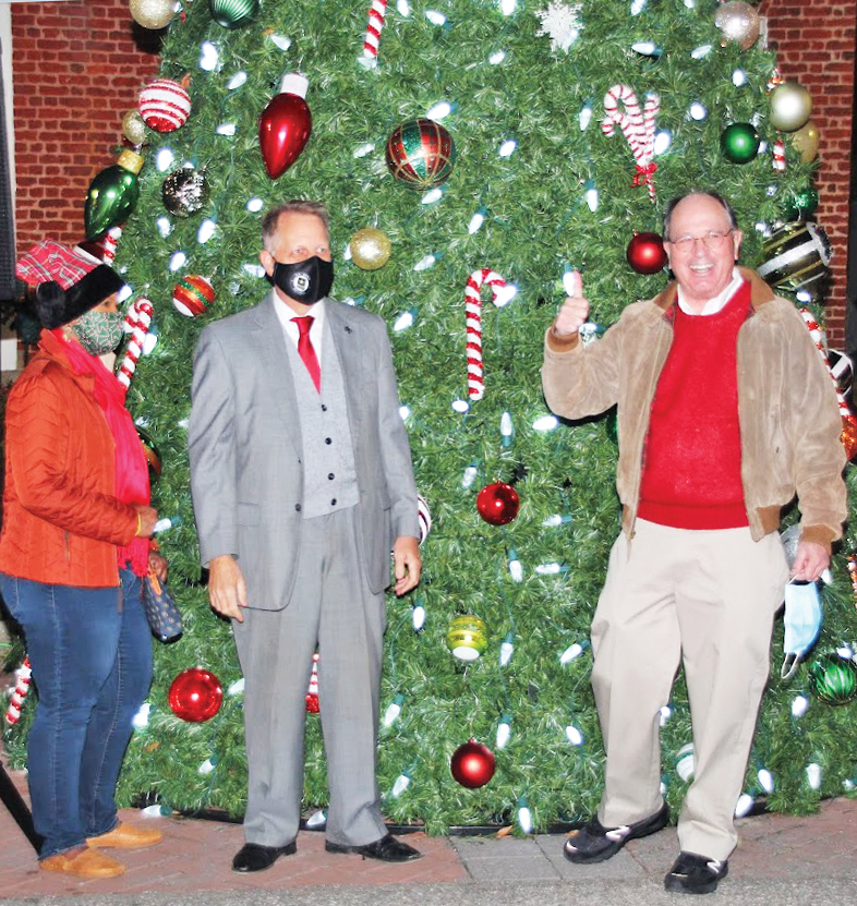 Mayor John McMeekin,right, SC Senator Mike Fanning (Dist. 17) and wife Stephanie Fanning lit the tree following the parade. Fanning and House Rep. Annie McDaniel were Grand Marshals of the 2021 Christmas parade.