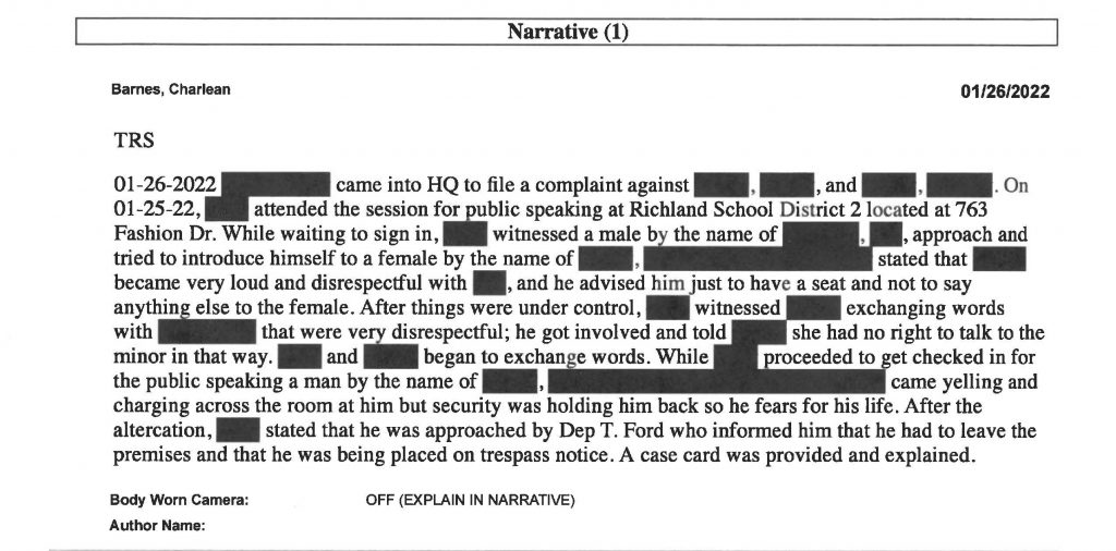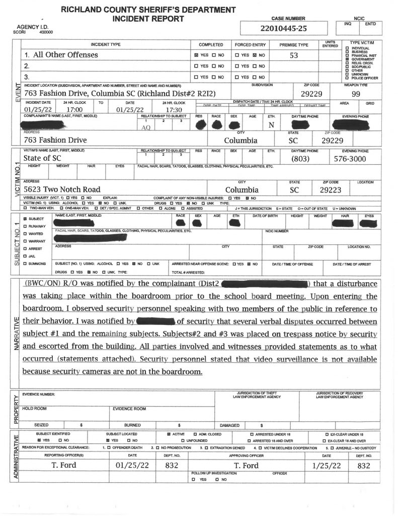 Two audience members involved, parent Gary Ginn and local blogger Gus Philpott, were subsequently removed from the meeting by Richland Two security after the two say they became targets of Pamela Davis’s anger. Both Ginn and Philpott say they were put on the Richland Two ‘trespassing list’ and will not be allowed to enter any R2 facilities or attend any R2 functions in the future. Both have filed complaints with the Richland County Sheriff’s Department. Those complaints and the Richland County Sheriff’s incident report are posted below.