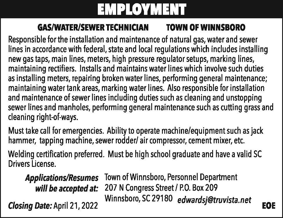 TOW Employment: Gas/Water/Sewer Tech