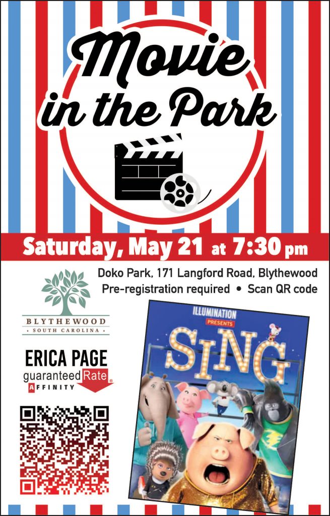 “This Saturday’s movie will be SING. It will start at 7:30 p.m. in Doko Park at 171 Langford Road in Blythewood,” said Erica Page with Guaranteed Rate Affinity, who is sponsoring the movies along with the Town of Blythewood. “We’ll have a food vendor, goody bags and several door prizes.”